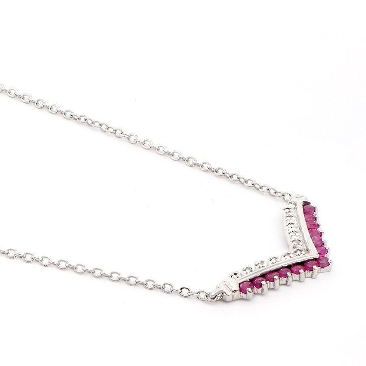 One Plated Rhodium 0.73ctw Ruby and Diamond Pendant with Chain. (13) Rubies with a total weight of 0.73cts. (11) diamonds with a total of 0.08cts with a color of H-I and clarity of I-3. Total weight of this pendant with chain is 3.29 grams. Total length of the chain is 18 inches.