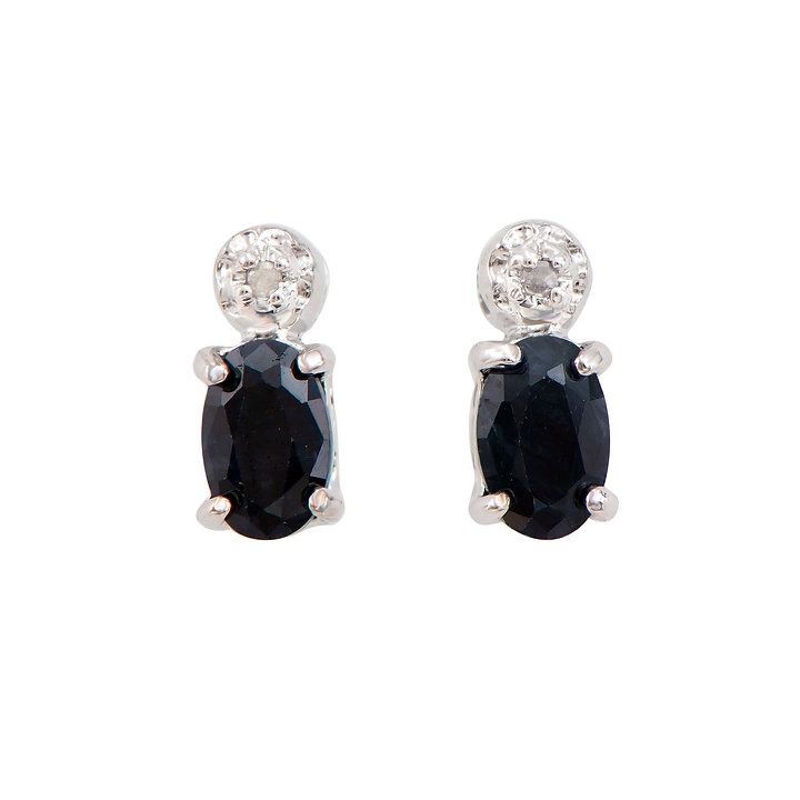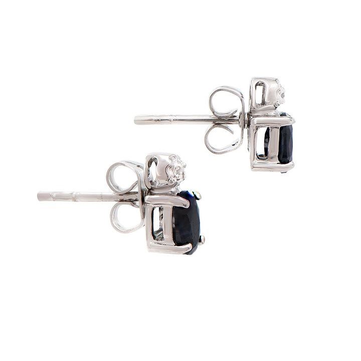 One pair of Plated Rhodium 1.32ctw Black Sapphire and Diamond Earrings. (2) black Sapphires with a total weight of 1.32cts. (2) diamonds with a total of 0.02cts with a color of H-I and clarity of I-3.Total weight of these earrings is 1.34 grams.