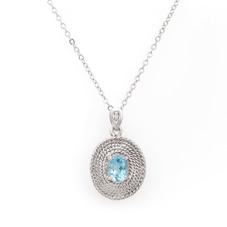 One Plated Rhodium 1.32ctw Blue Topaz and Diamond Pendant with Chain. (1) Blue Topaz stone with a total weight of 1.32cts. (1) diamond with a total of 0.01cts with a color of H-I and clarity of I-3. Total weight of this pendant with chain is 4.78 grams. Total length of the chain is 18 inches.
