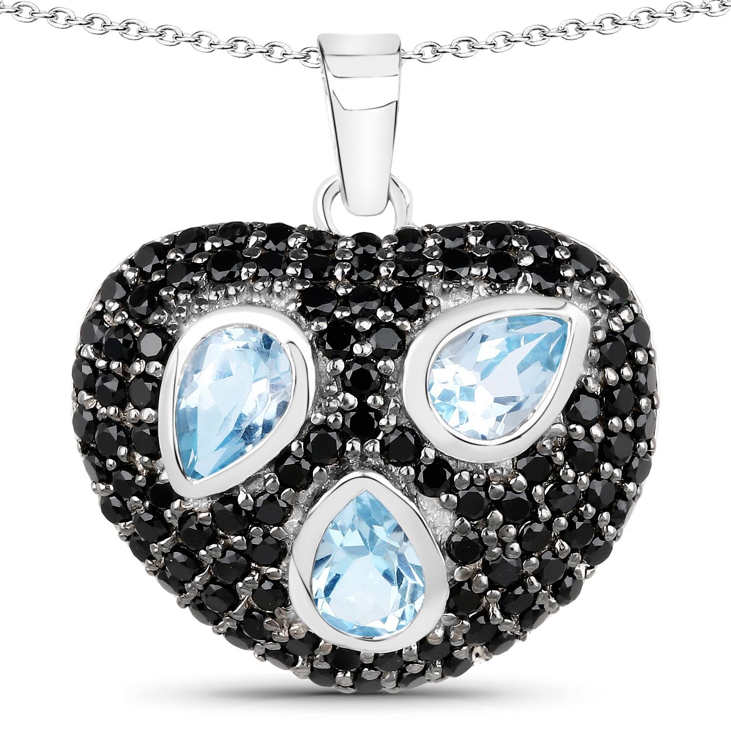 3.52 Carat Genuine Blue Topaz and Black Spinel.925 Sterling Silver Pendant. Blue Topaz Pear/6x4mm - 3/1.44 ctw Prong Setting Natural Irradiated E + Black Spinel Round/1.50mm - 104/2.08 ctw Natural Not Treated N. Total weight 6.18 grams. 18 inch chain.