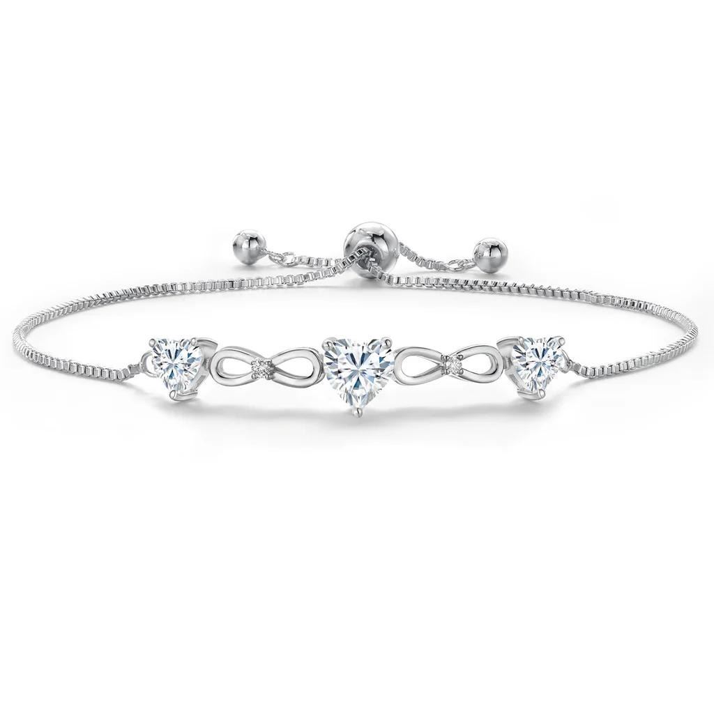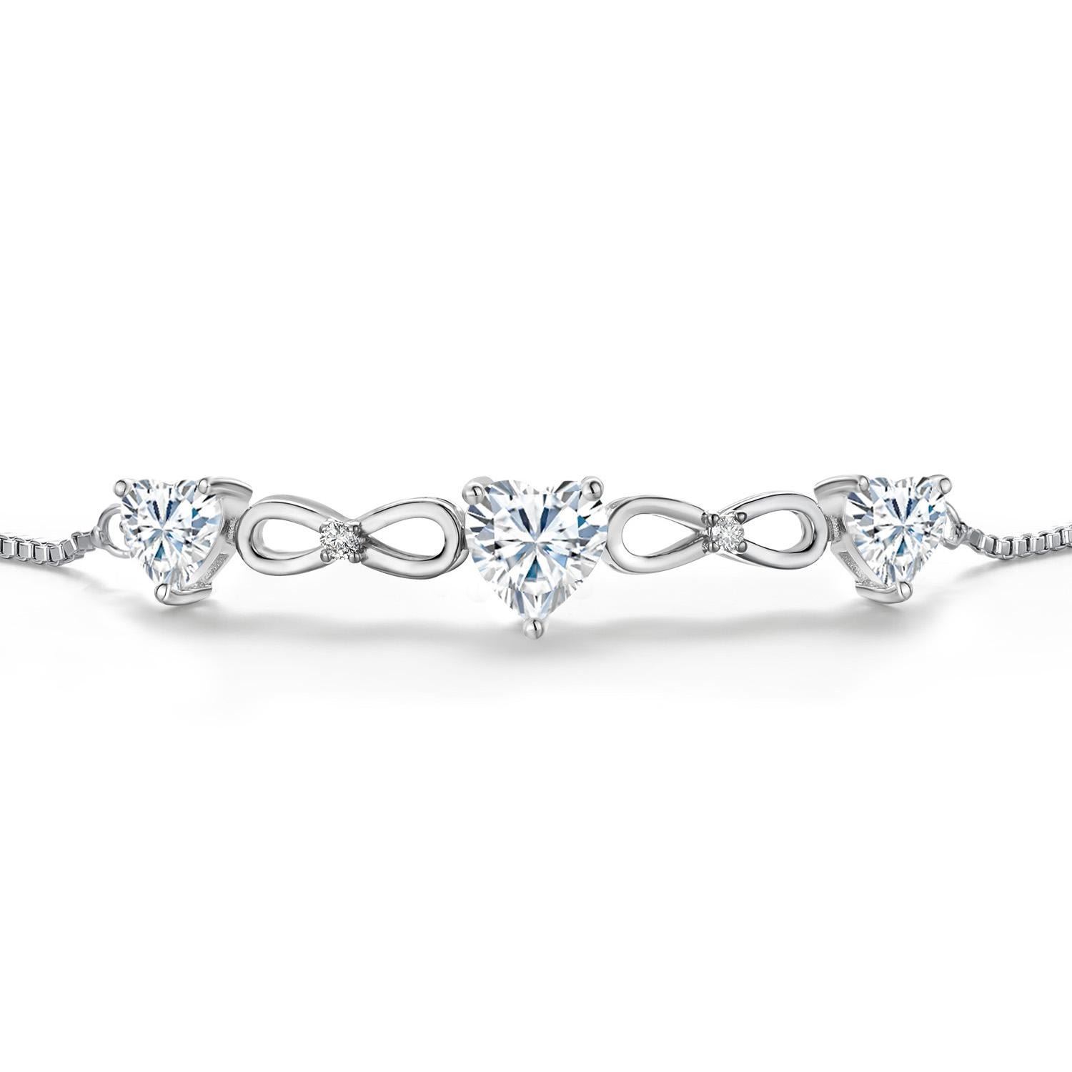 Rhodium?plated link bracelet showcasing a vibrant 0.80 ct heart?shaped near?colorless GH Moissanite at center, framed by two near?colorless GH moissanite heart accents totaling 0.84 cttw, with additional round moissanite sparkle for a refined finishing touch. Measuring 9 inches with a slim 228 x 2 mm profile and secured by a box?with?tongue clasp. Main stone is 6mm. 2 side stones are 5mm. Bracelet is adjustable.