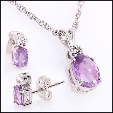 One set of Plated Rhodium 1.90ctw Amethyst Pendant with Chain and Earrings. (1) Amethyst stone with a total weight of 1.05cts. (2) Amethyst stones with a total weight of 0.85cts. (3) Diamonds with a total weight of 0.025cts with a color of I-J and clarity of I-3. Total weight of these items is 3.05 grams.