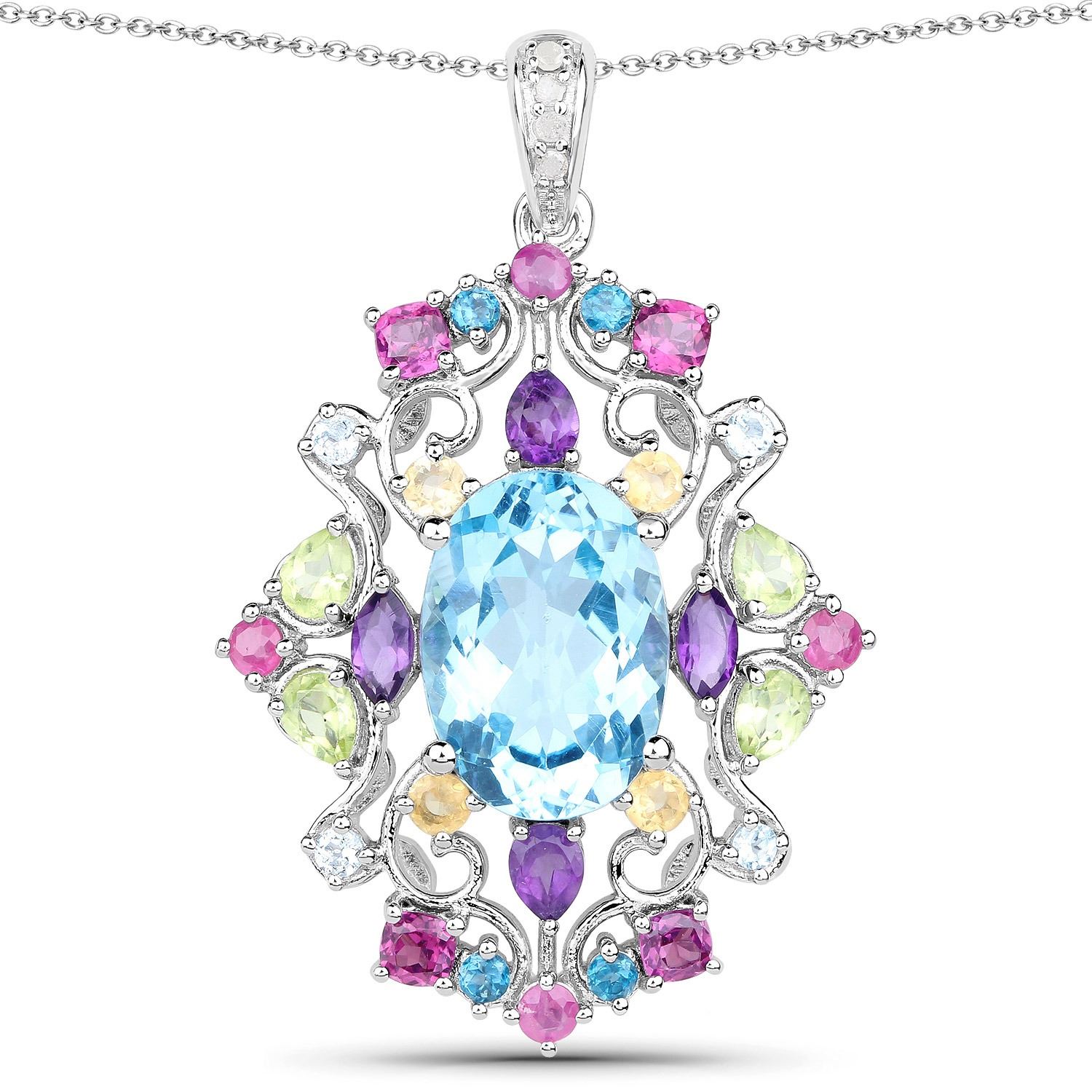 10.43 Carat Genuine Multi Stones.925 Sterling Silver Pendant. Blue Topaz Oval/14x10mm - 1/7.50 ctw Prong Setting Natural Irradiated E + Peridot Pear/4x3mm - 4/0.64 ctw Natural Not Treated N + Amethyst Marquise/5x2.50mm - 2/0.30 ctw Natural Not Treated E + Amethyst Pear/4x3mm - 2/0.30 ctw Natural Not Treated E + Rhodolite Garnet Cushion/3.00mm - 4/0.80 ctw Natural Not Treated N + Ruby Round/2.50mm - 4/0.30 ctw Natural Heat Treated F + London Blue Topaz Round/2.00mm - 4/0.14 ctw Natural Irradiated E + Citrine Round/2.50mm - 4/0.26 ctw Natural Heat Treated N + Blue Topaz Round/2.00mm - 4/0.14 ctw Natural Irradiated E + White Diamond Round/1.30mm - 2/3.90 ctw Natural Not Treated N I-J I2-I3. Total weight 9.03 grams. 18 inch chain.