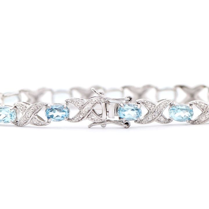 One Plated Rhodium 11.30ctw Blue Topaz and Diamond Bracelet. (12) blue Topaz stones with a total weight of 11.26cts. (12) Diamonds with a total weight of 0.10cts with a color of H-I and clarity of I-3. Total weight of this bracelet is 11.96 grams. Length of bracelet is 7.5 inches.