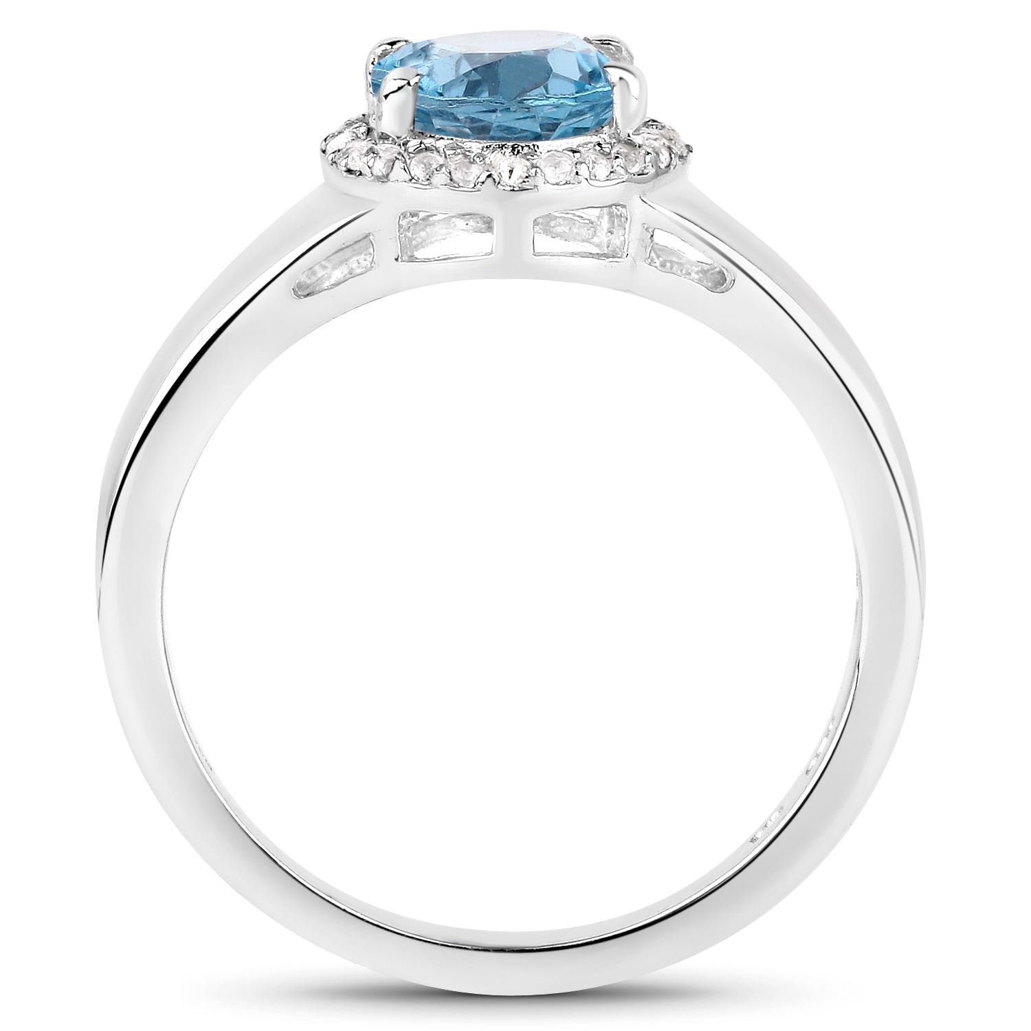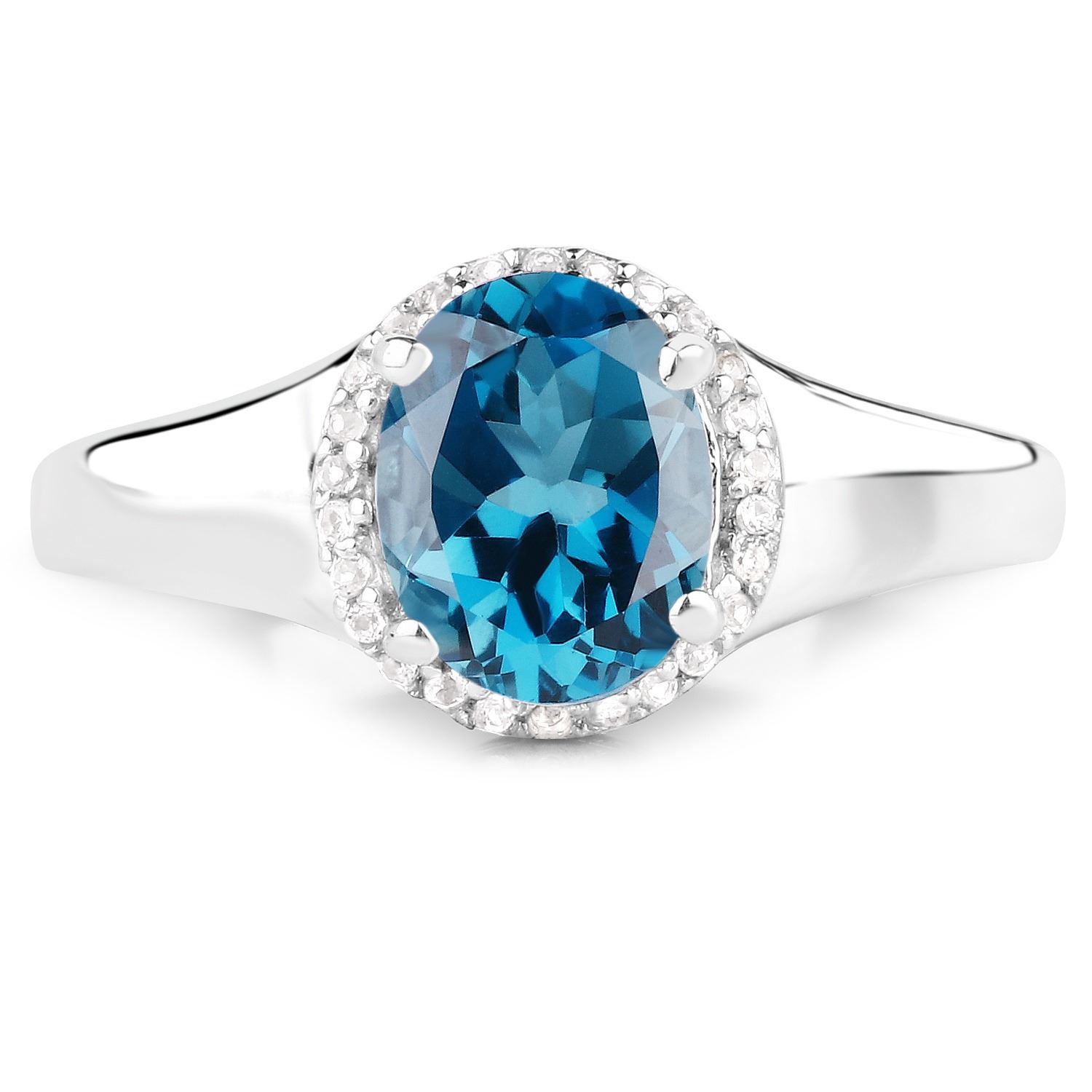 This rhodium?plated .925 sterling silver solitaire ring features a striking 9×7?mm natural London blue topaz weighing 2.25 carats, accented by twenty?six round 1?mm natural white topaz stones totaling 0.13 carats. With a combined gemstone weight of 2.38 ctw, the design delivers vivid blue color framed by bright, delicate sparkle. The piece measures 9.65?mm in width, 10.16?mm in length, and 6.10?mm in height, with a lightweight 3.47?gram. Ring size 6.