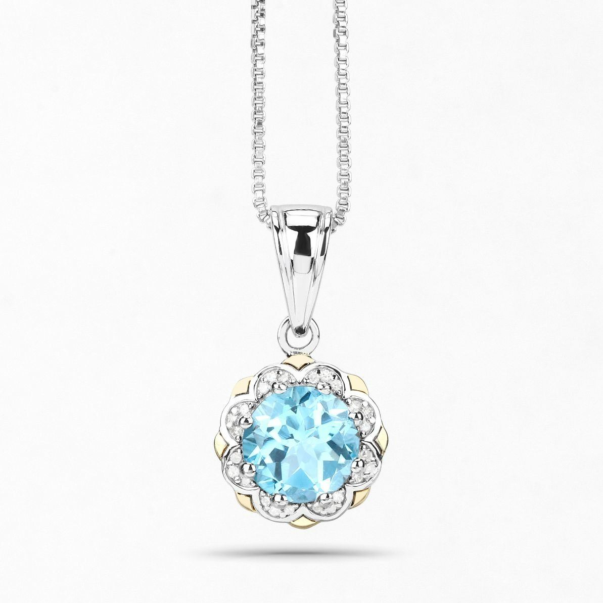 2.32 Carat Genuine Swiss Blue Topaz and White Diamond 14K Yellow Gold with.925 Sterling Silver Pendant. Swiss Blue Topaz Round/8.00mm - 1/2.25 ctw Prong Setting Natural Irradiated E + White Diamond Round/0.80mm - 24/0.07 ctw Natural Not Treated N. Total weight 4.17 grams. 18 inch chain.