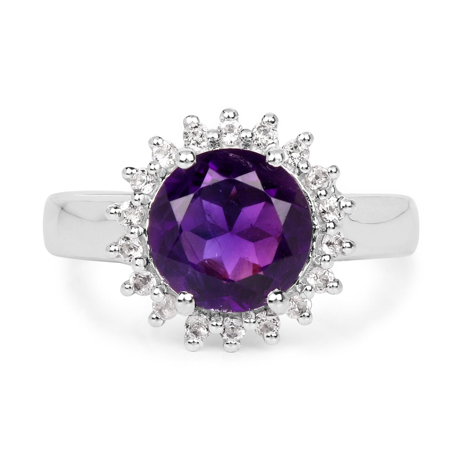 2.40 Carat Genuine Amethyst and White Topaz .925 Sterling Silver Ring. Amethyst Round/9.00mm - 1/2.40 ctw Natural Not Treated E + White Topaz Round/1.50mm - 18/0.40 ctw Natural Heat Treated C. Total weight of this ring is 4.87 grams. Ring size 7.