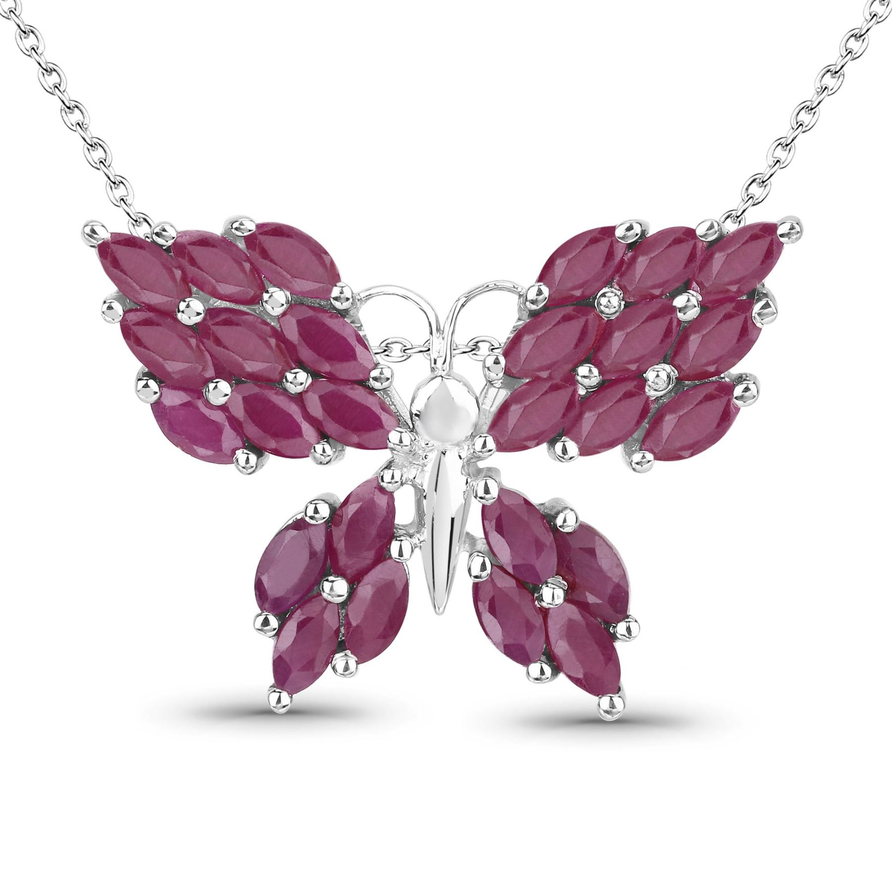 This rhodium?plated .925 sterling silver butterfly pendant features 3.12 ctw of natural, heat?treated marquise?cut rubies, with twenty?six 5×2.50 mm stones creating a vivid pink?red wing design. With a 6.60?gram gross weight and bold 31.24 mm width, it hangs from a classic cable chain with a spring?ring clasp.