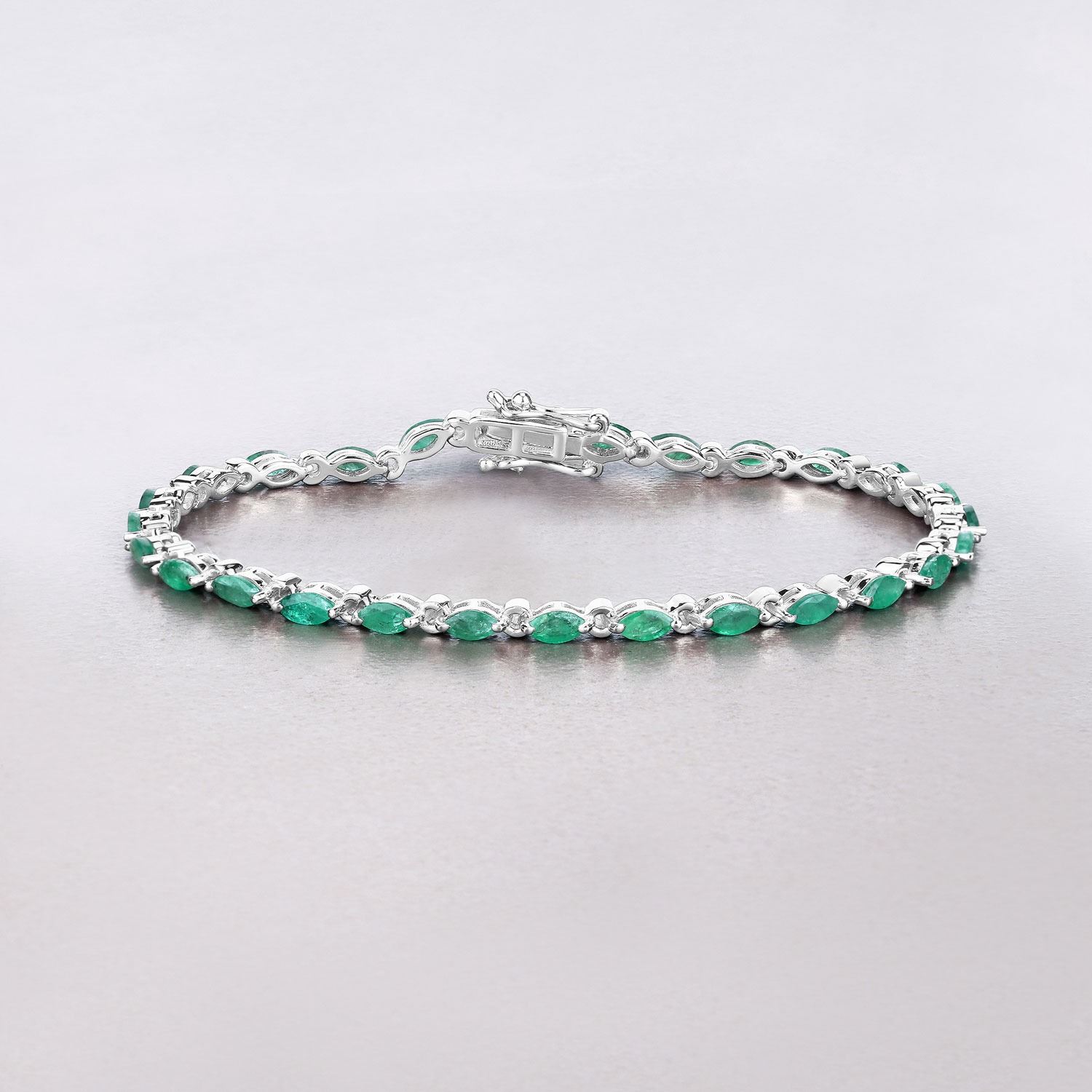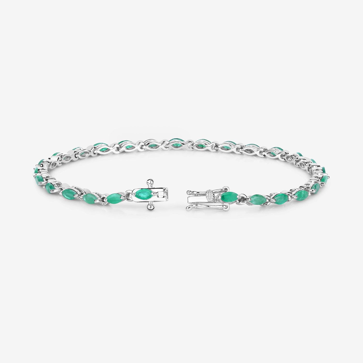 This rhodium?plated .925 sterling silver Zambian emerald link bracelet offers refined elegance with a gross weight of 7.50 grams and a total natural gemstone weight of 3.24 carats. The design features twenty?seven 5×2.50 mm natural marquise?cut Zambian emeralds—oiled for clarity and prong?set to showcase their rich green color—bringing the total stone count to 27. Measuring 7 inches in length with a secure box clasp featuring tongue?and?safety closure, this May?birthstone bracelet delivers sleek proportions (4.32 mm height, 3.05 mm width) and a vibrant, gemstone?forward look that stands out beautifully in any fine jewelry collection