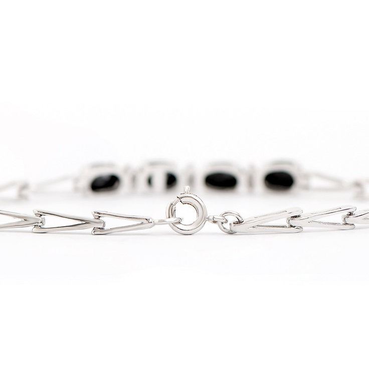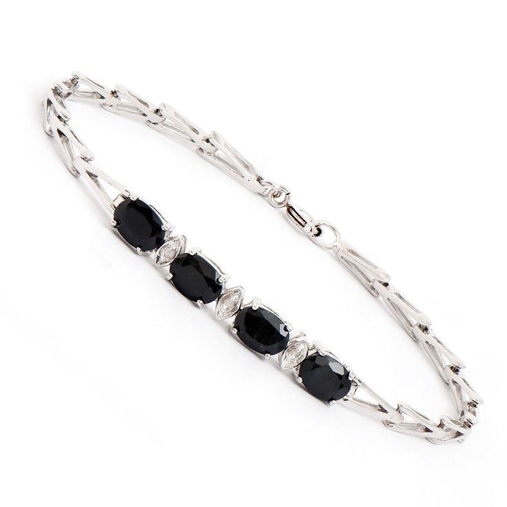 One Plated 4.05cts Sapphire and Diamond Rhodium Bracelet 7.5 in. (4) Black Sapphire stones with a total weight of 4.02cts. (3) diamonds with a total of 0.03cts with a color of H-I and clarity of I-3. Total weight of this bracelet is 5.3 grams.