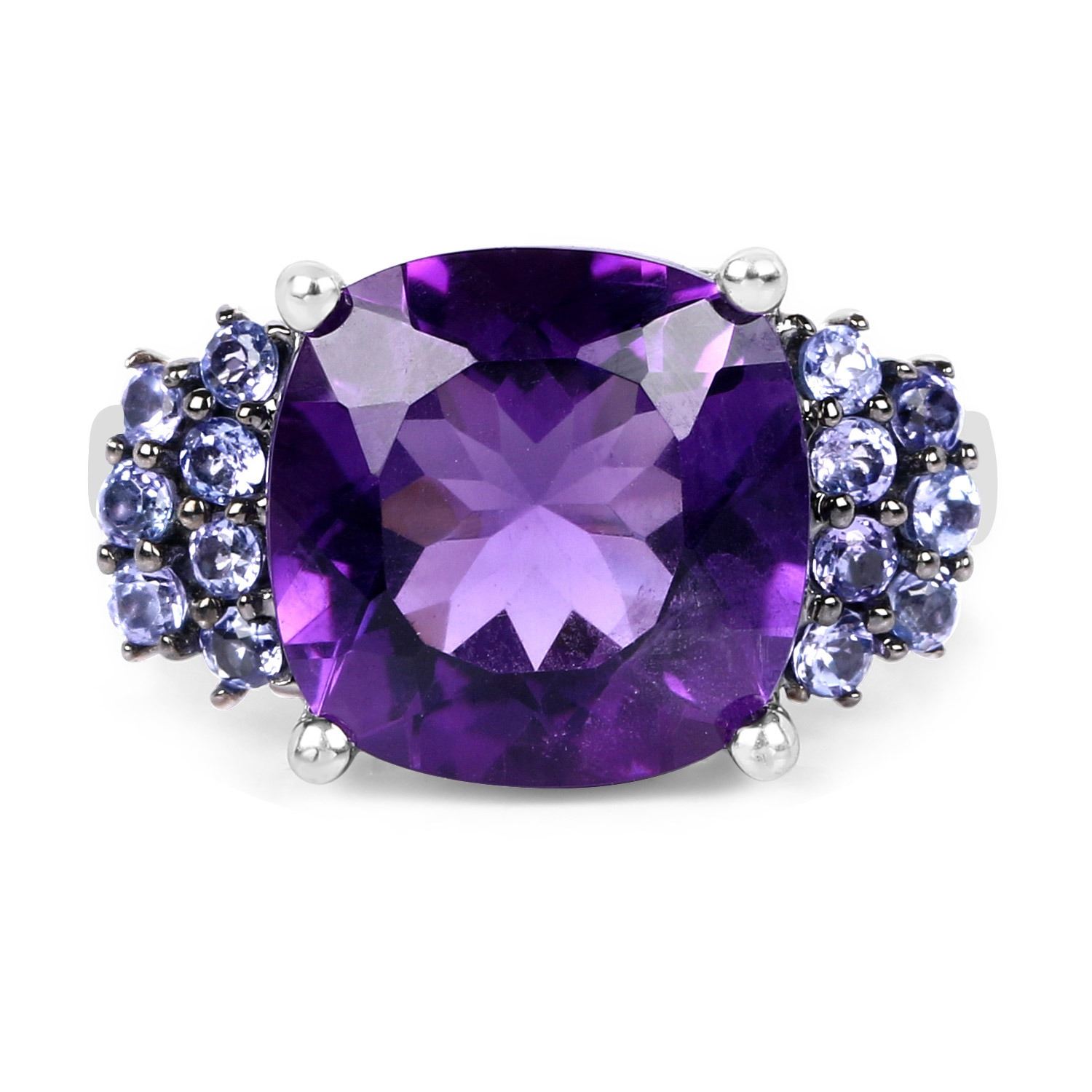 6.34 Carat Genuine Amethyst and Tanzanite.925 Sterling Silver Ring. Amethyst Cushion/12.00mm - 1/5.85 ctw Prong Setting Natural Not Treated E + Tanzanite Round/1.90mm - 14/0.49 ctw Natural Heat Treated E. Total weight 5.37 grams. Ring size 9.