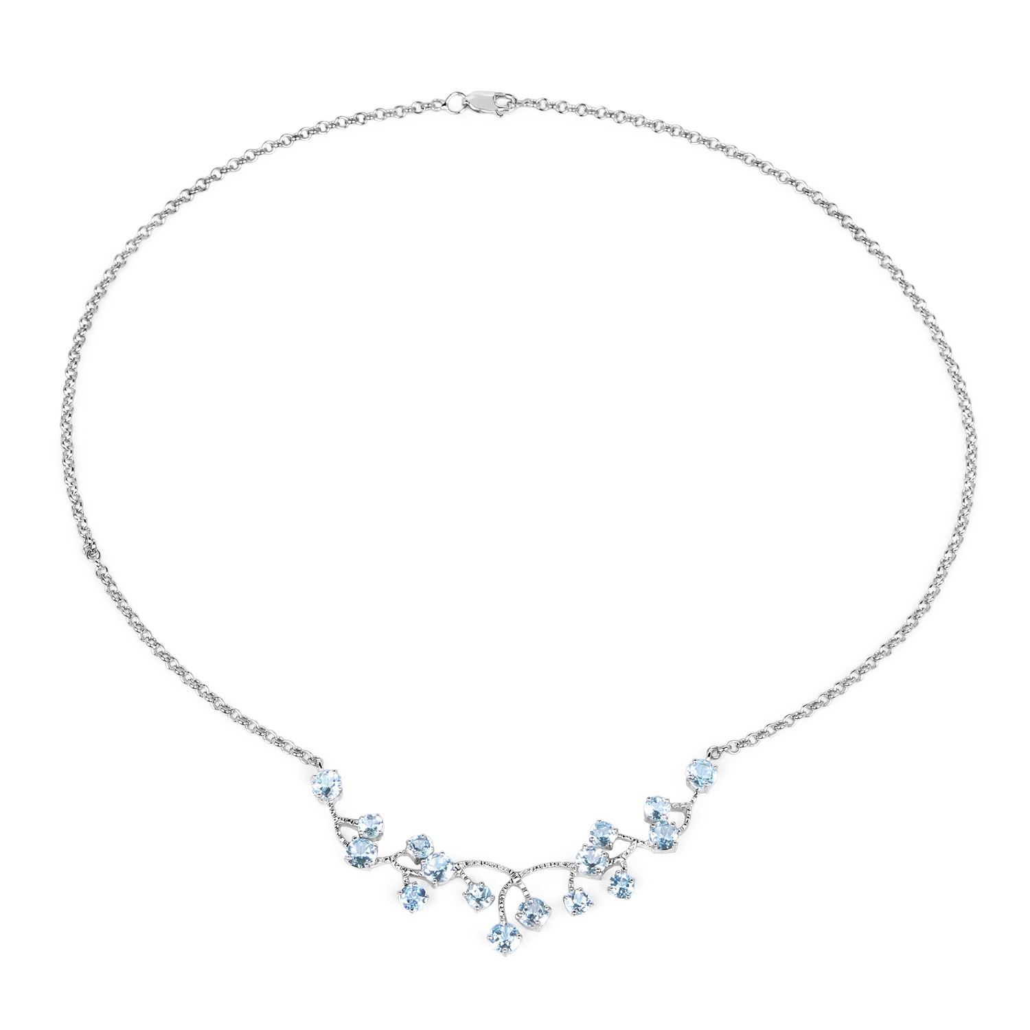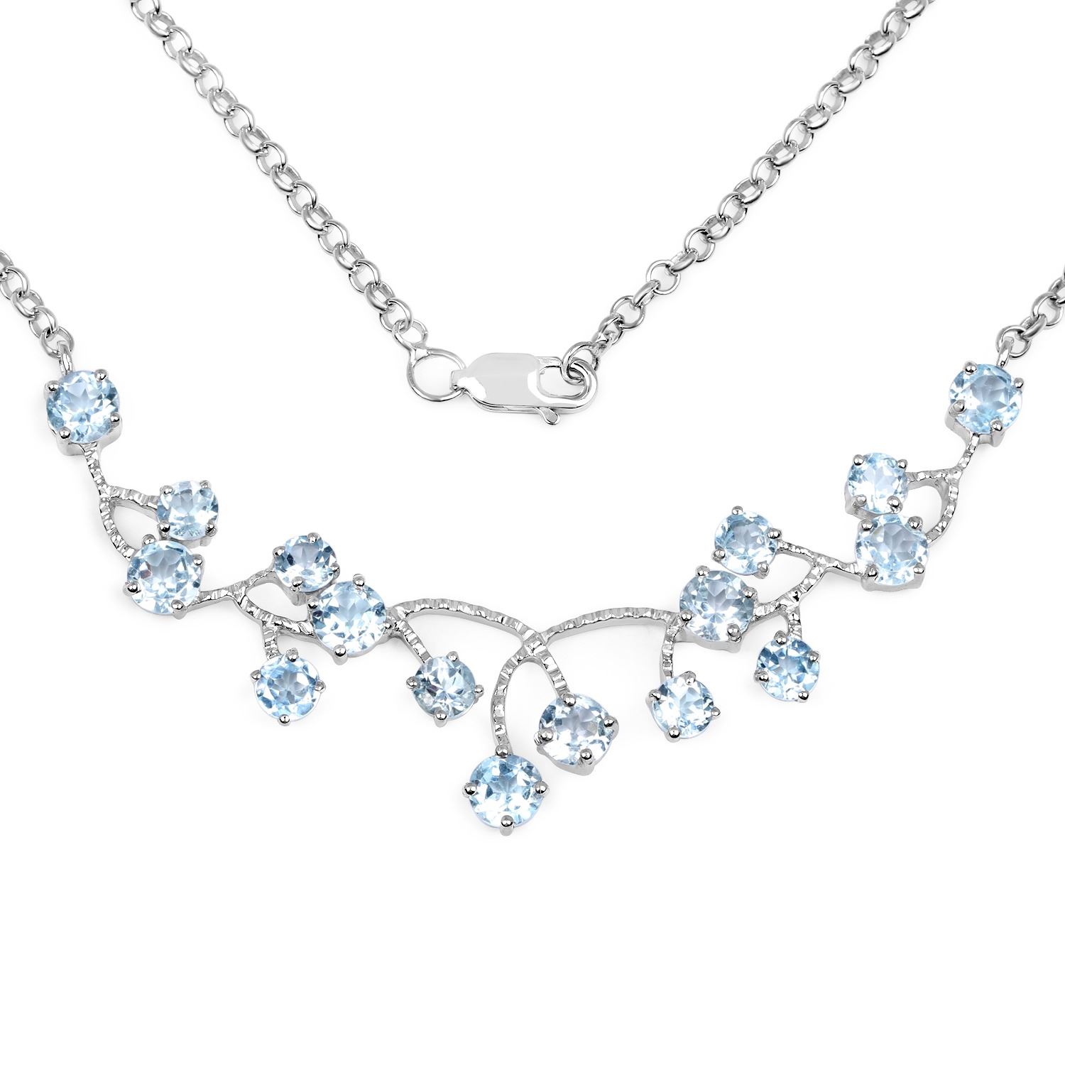 This rhodium?plated .925 sterling silver cocktail necklace showcases 7.36 ctw of natural irradiated blue topaz, featuring eight 5.00 mm rounds (4.80 ctw) and eight 4.00 mm rounds (2.56 ctw) arranged across a bold 66.04 mm span. With a substantial 10.2?gram gross weight and a secure lobster clasp on a 449.83 mm chain, this December?birthstone piece delivers vivid blue color, strong sparkle, and a standout gemstone presence perfect for collectors.