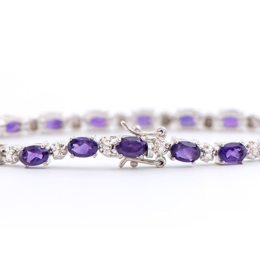 One Plated Rhodium 7.45ctw Amethyst and Diamond Bracelet. (20) Amethyst stones with a total weight of 7.45cts. Diamonds with a total weight of 0.02cts with a color of I-J and clarity of I-3. Total weight of this bracelet is 11.05 grams. The length of this bracelet is 7 1/2 inches.