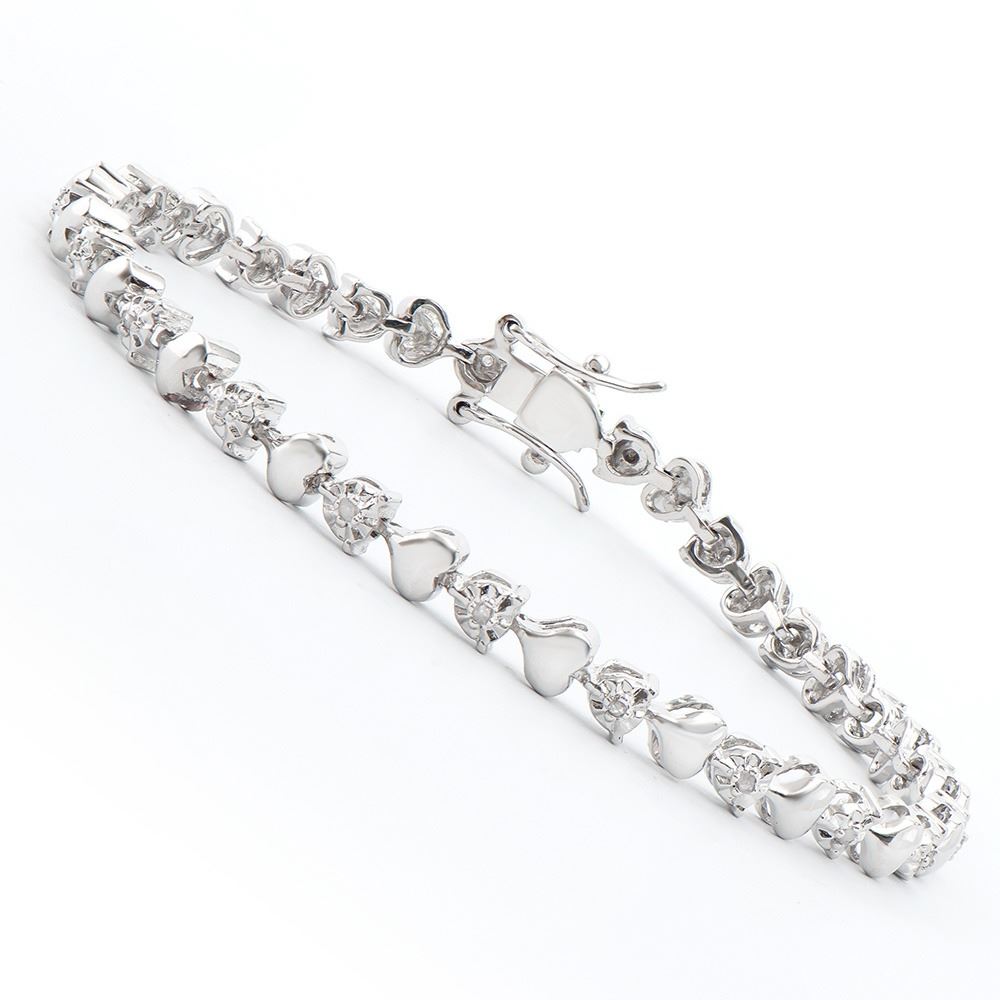 One Plated Rhodium Diamond Heart Bracelet. (21) round Diamonds with a color of I-J and clarity of I-3. Total weight of this bracelet is 9.55 grams. The length of this bracelet is 7 1/2 inches.