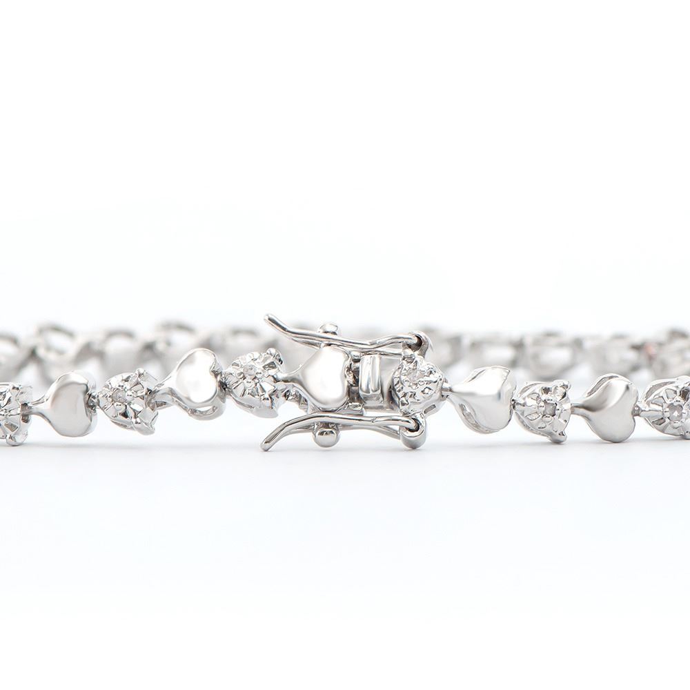 One Plated Rhodium Diamond Heart Bracelet. (21) round Diamonds with a color of I-J and clarity of I-3. Total weight of this bracelet is 9.55 grams. The length of this bracelet is 7 1/2 inches.