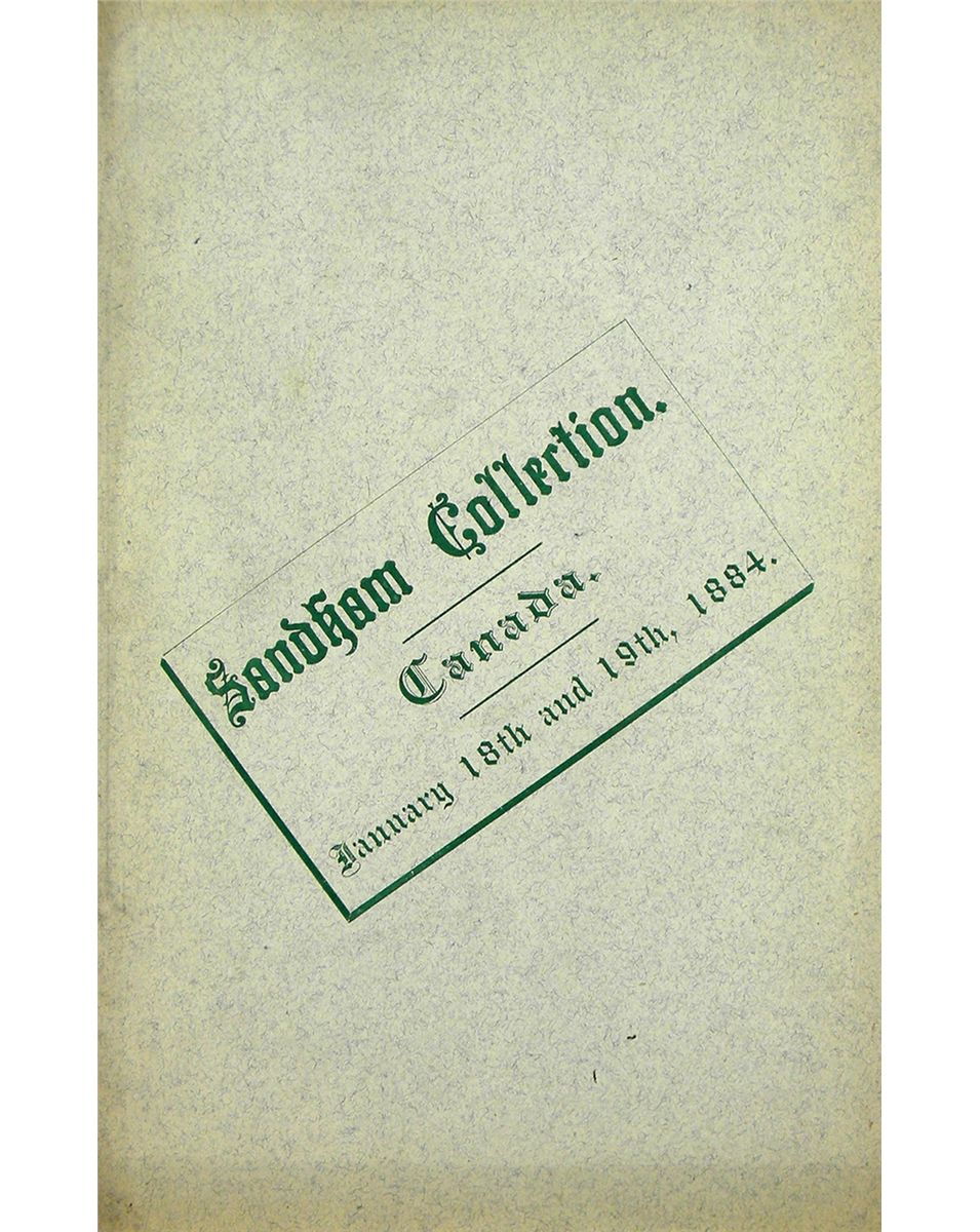 Smith, H.P. THE NUMISMATIC COLLECTIONS OF ALFRED SANDHAM AND GEORGE CUSHING OF MONTREAL, CANADA. New York: Bangs, Jan. 18-19, 1884. 8vo, original printed wraps. 53, (1) pages; title printed in green and black; 916 lots; 2 fine artotype plates depicting Canadian medals and tokens. Covers just a trifle worn and dusty. Near fine. An important collection of Canadian medals and tokens consigned by Alfred Sandham, one of the great early Canadian collectors. Not in the Fuld Library or the American Numismatic Society Dictionary Catalogue. Ex Harry W. Bass, Jr. library (Kolbe Sale 80, lot 503). Ex Dave Steine library.