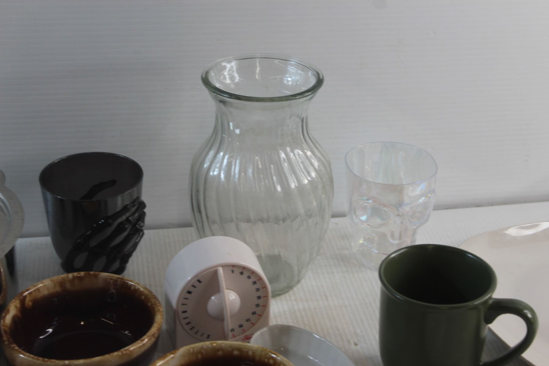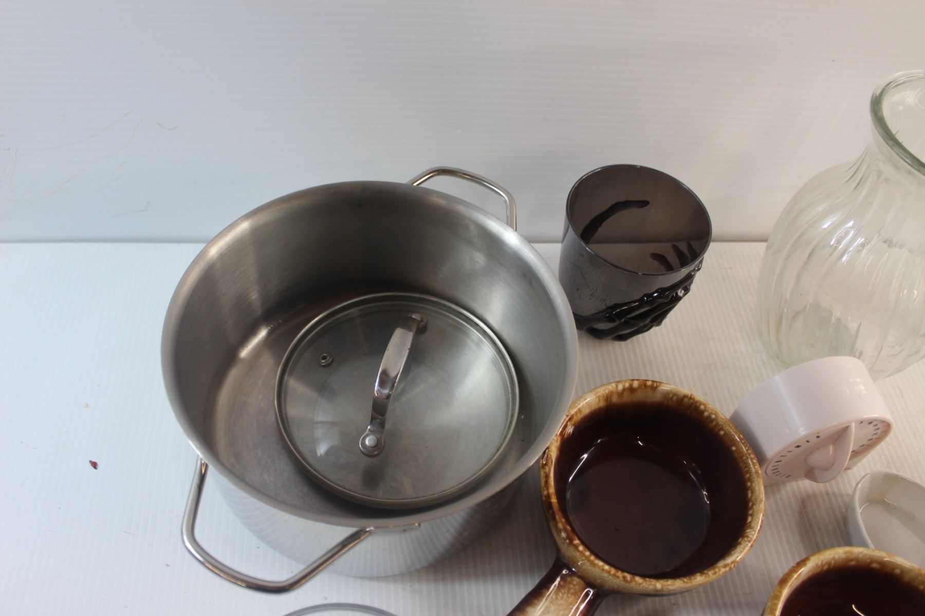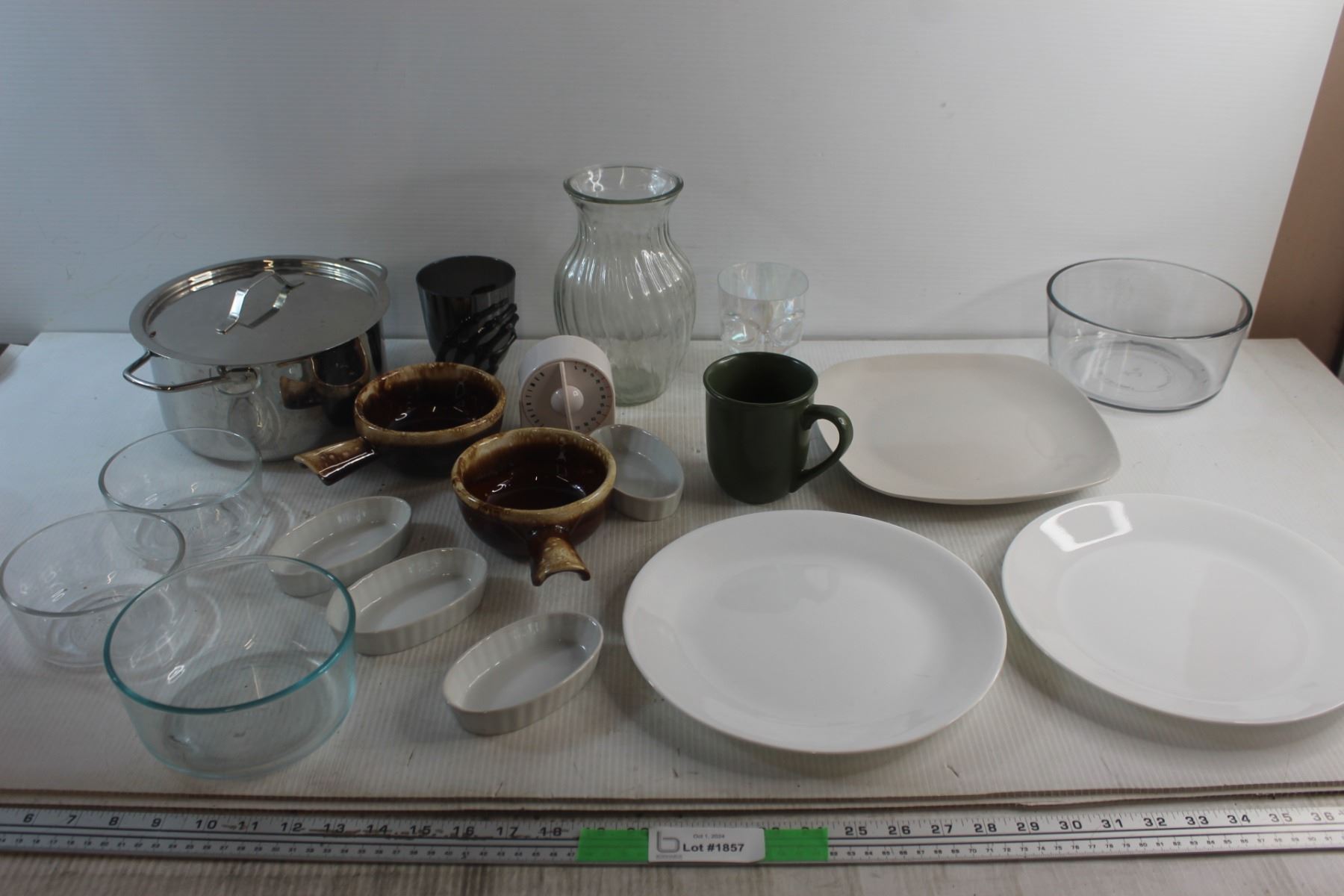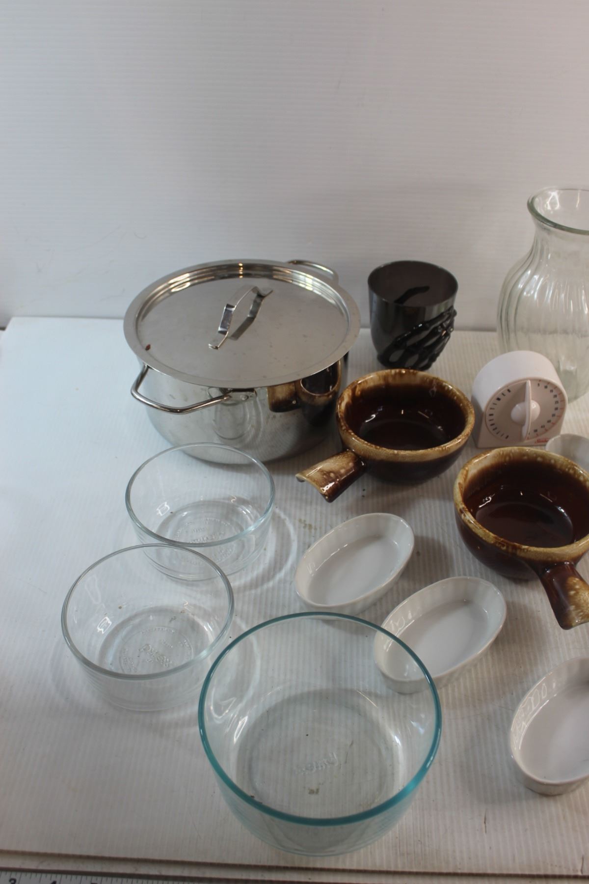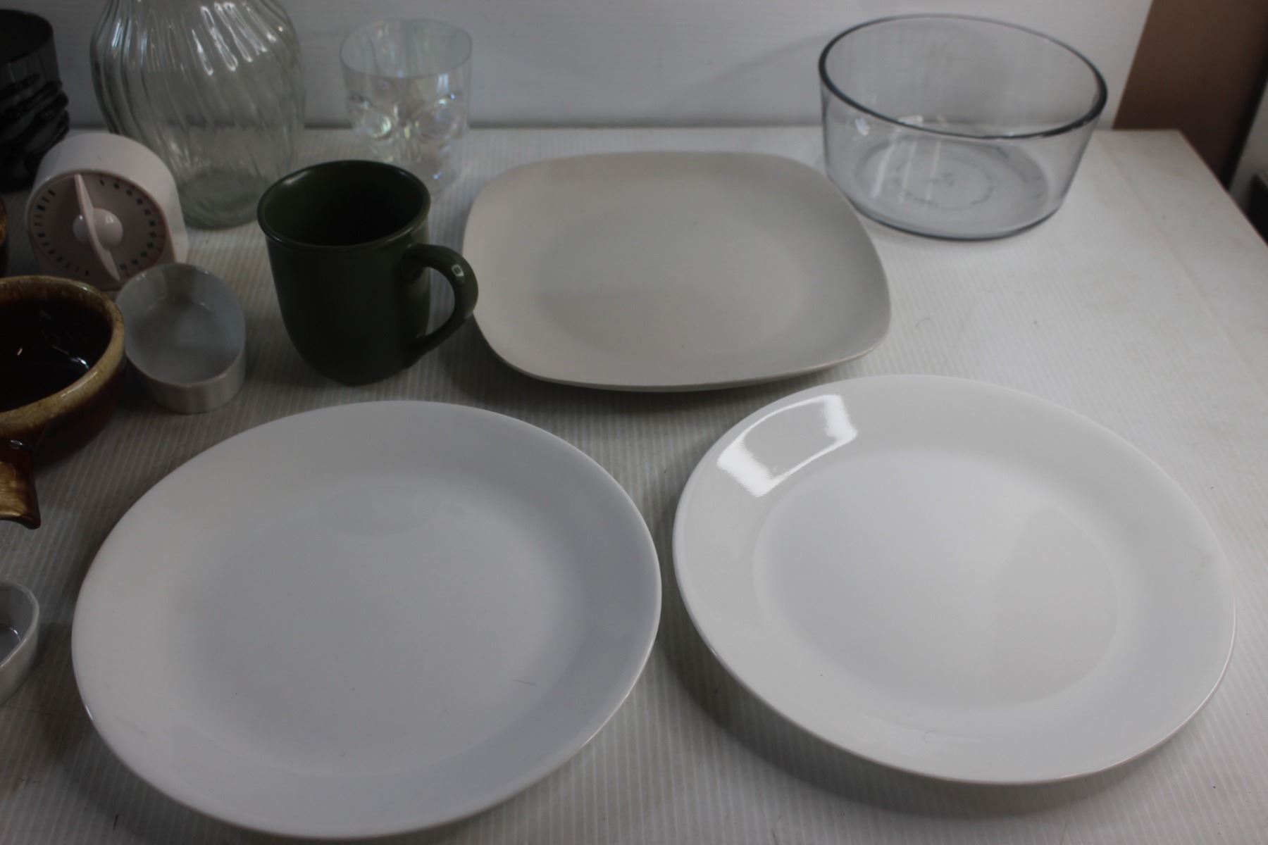 Plates, Pyrex Bowls, Pot, Cups, Timer and Vase