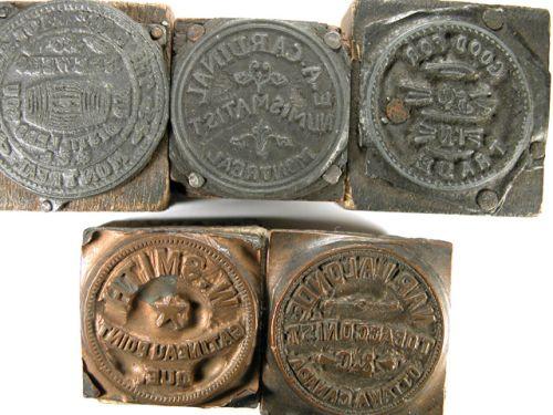 Breton 562, Ths & Wm Molson, Montreal, Carved Wooden Printing Block for reverse. Plus Breton 577, EA Cardinal, Montreal, Cast Metal Printing Plate for obverse mounted on wooden block, Breton 620, IB Durocher, Montreal, Cast Metal Printing Plate for reverse mounted on wooden block and Breton 632, W Smith, Gatineau Point, Que, Copper-Clad Lead Printing Plate, never mounted and Breton 783, Nap Lalonde, Ottawa, Copper-Clad Lead Printing Plate, never mounted. Total five pieces