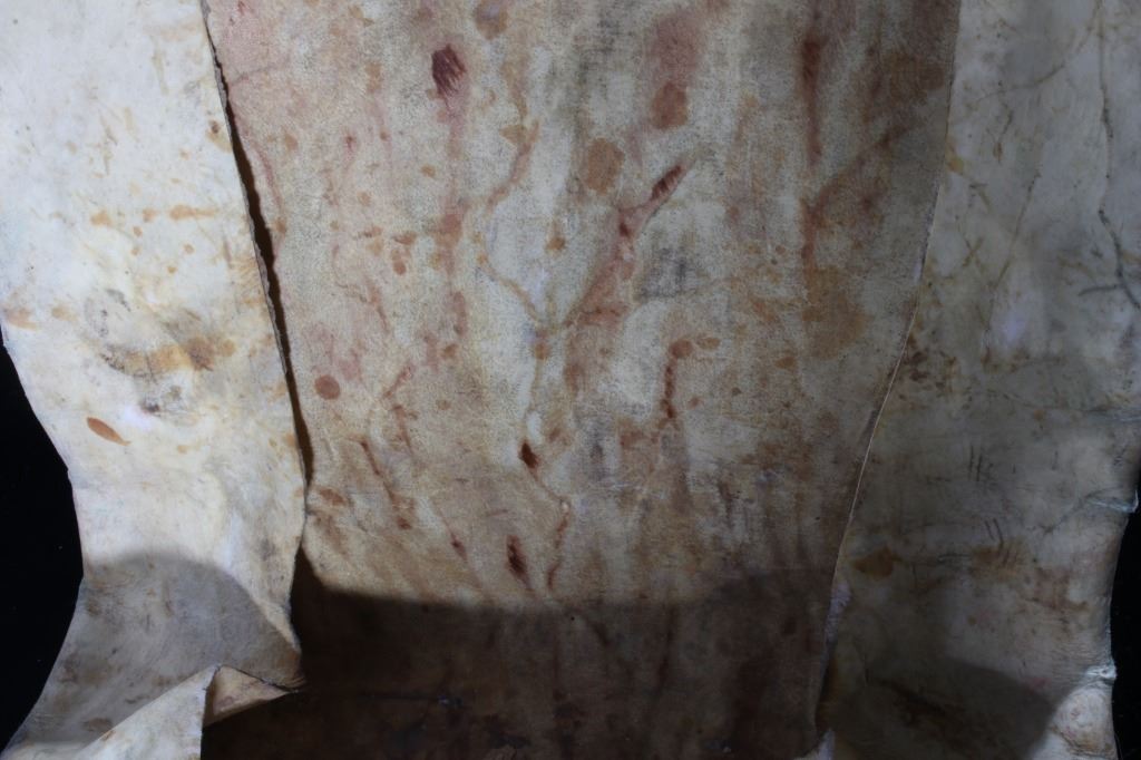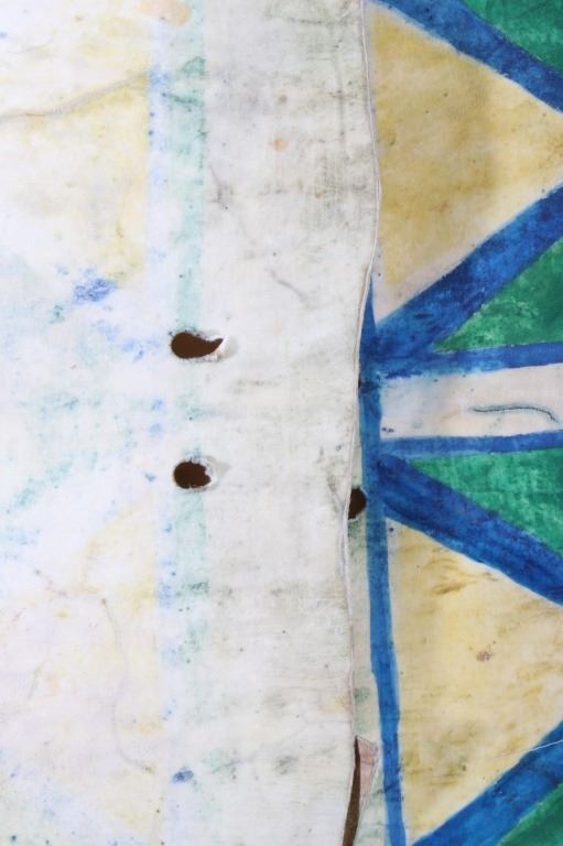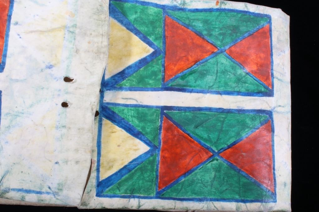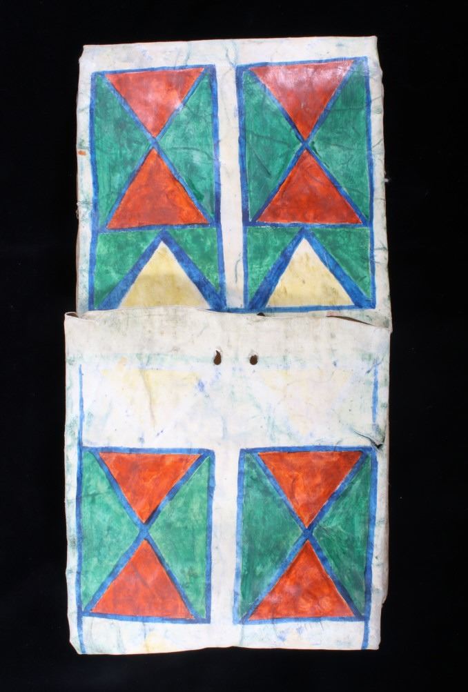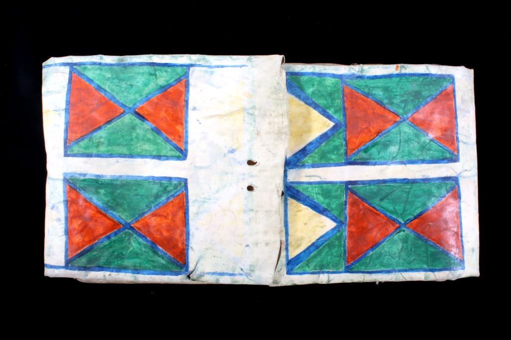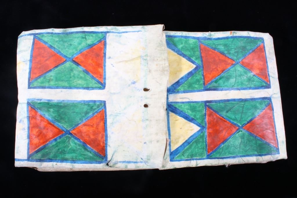 This is a fantastic geometric pattern pigment polychrome painted parfleche envelope from the Plateau Native American Indians and dating to the 19th Century. Provenance: From the renowned Sundog Fine Art Bozeman, Montana collection and collected by Bruce VanLandingham. Bruce VanLandingham was a pillar in the American Indian collecting community and a respected expert. Along with being an avid collector Bruce also was the sole owner of Sundog Fine Art Gallery in Bozeman which was both part museum and gallery. The piece shows a Great American Bison Buffalo parfleche rawhide construction with exceptional mineral ocher pigment polychrome painted design in a geometric traditional pattern showing reds, blues and greens. The bag is held together with what is believed to be the original Indian brain tanned hide tie strap, a rare addition. The term parfleche was first coined by the French fur traders and derived from the French word parer meaning defend and fleche meaning arrows, as the hide was tough enough to be used as a shield and deflect an arrow. The original containers had graphics that were maps, geographical depictions such as rivers and mountains, or symbols that told the families stories. Once the parfleche left the family, the story was lost and the parfleche became Indian art rather than a meaningful storyteller. This piece shows fine original paint and overall good condition for being well over 100 years of age. Many examples offered for sale are merely tourist trade parfleche with poor painting and thin hides, which this example is most definitely not as it shows a heavy Bison hide and wonderful painting dating to the circa 1850-1890s. This is truly a extraordinary nomadic traveling storage piece that now is seen as one of the original American works of art. The piece has the original Museum collection metal and paper tag which shows an identification number and states this as being a Plateau Parfleche. When tied shut, the envelope measures 24 ½ inches long by 13 inches wide by 4 inches thick. Plateau Parfleche envelopes are some of the finest polychrome painted parfleche on the market with such examples selling for $2,700 at Cowan's 2013 sale and $2,200 at Cowan's 2010, with this example shows a brighter design and finer condition.