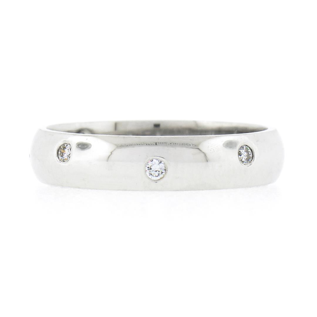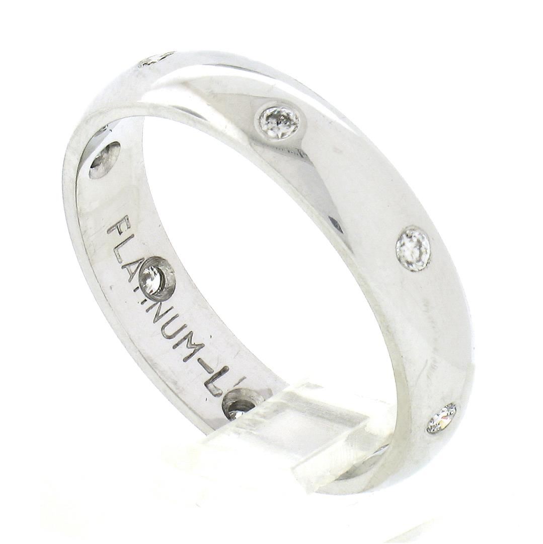 A solid platinum dome eternity band ring, with 8 round brilliant cut natural diamonds (G - VS1/VS2 ; 0.16ctw). The ring is size 6.5, weighs a total of 5.37 grams, and measures 4.1mm wide.