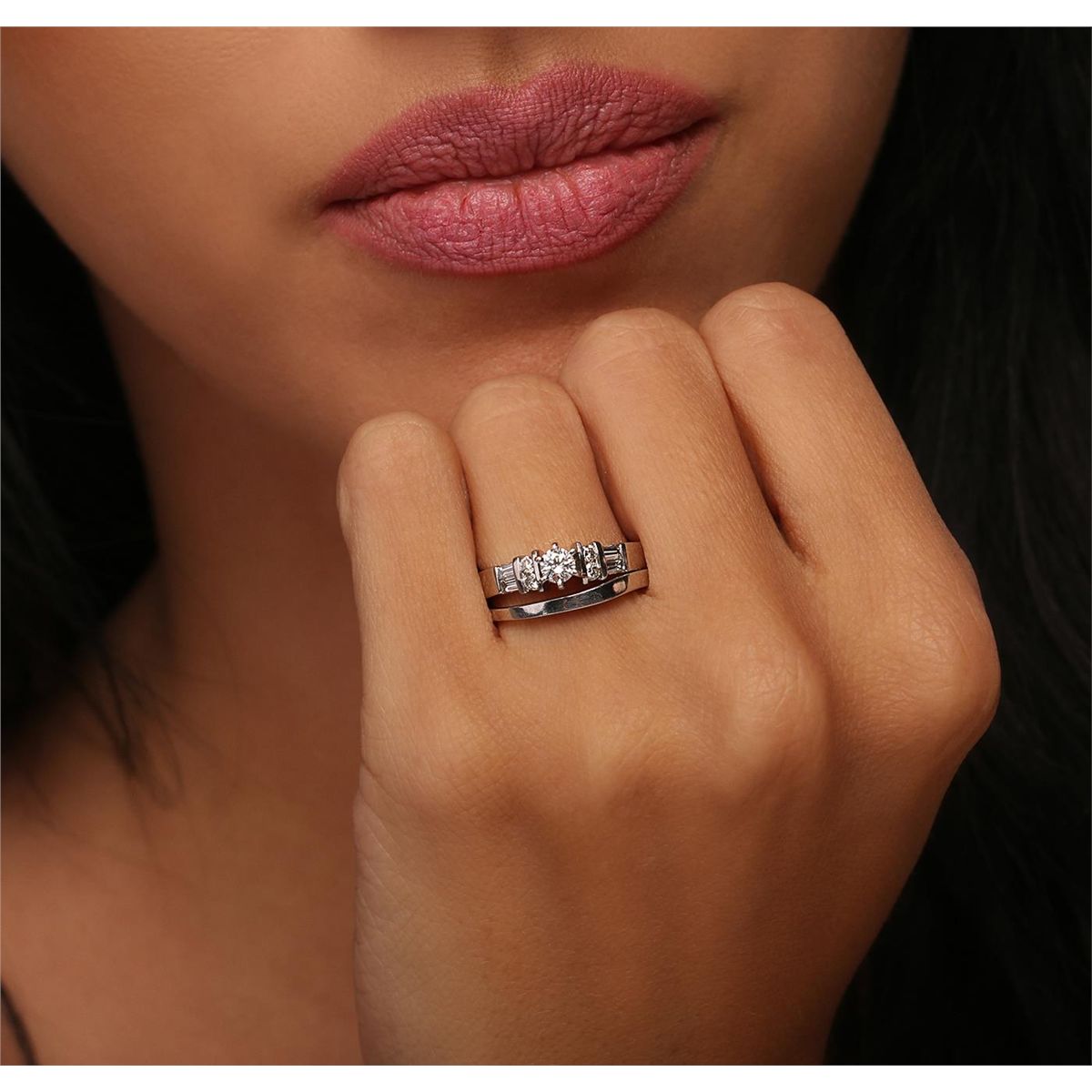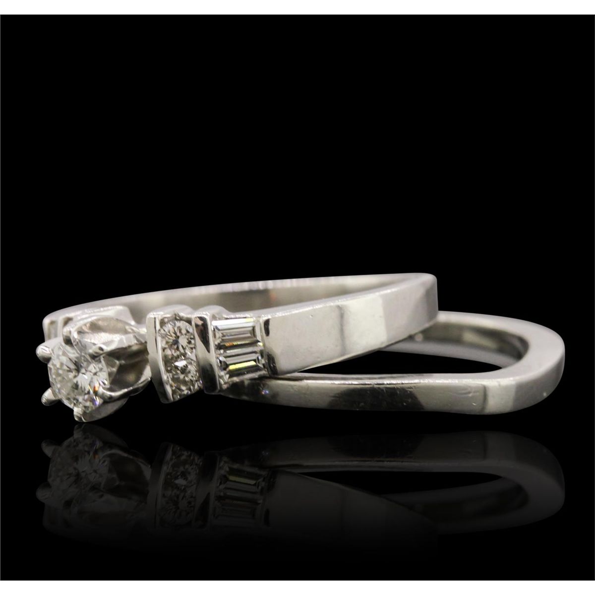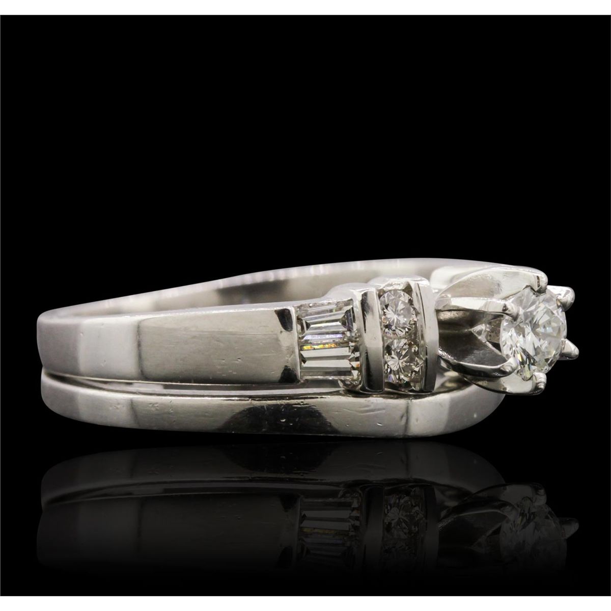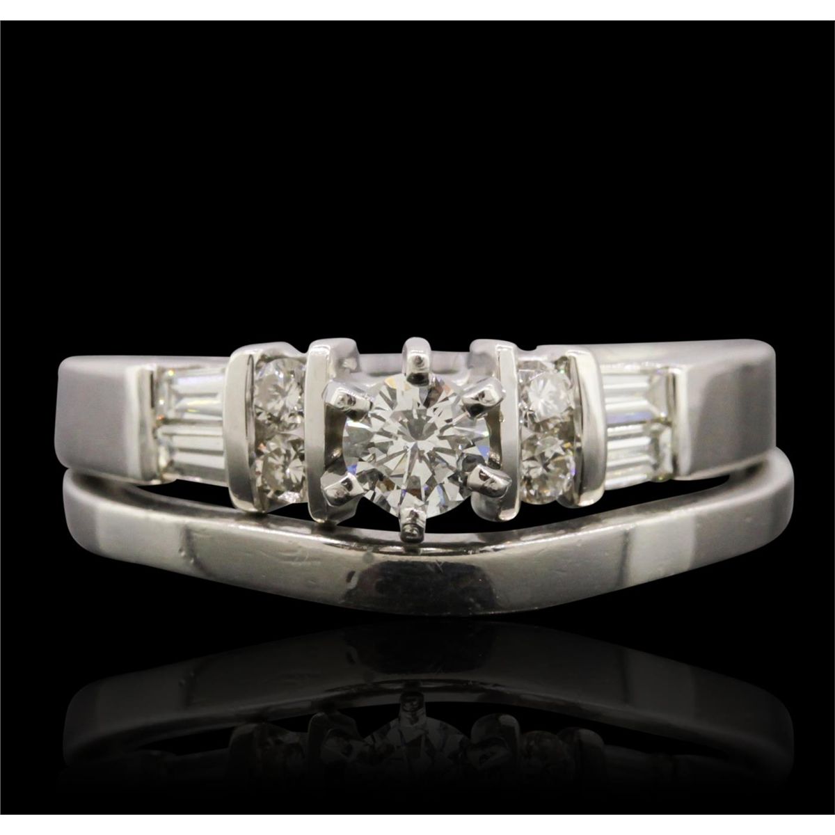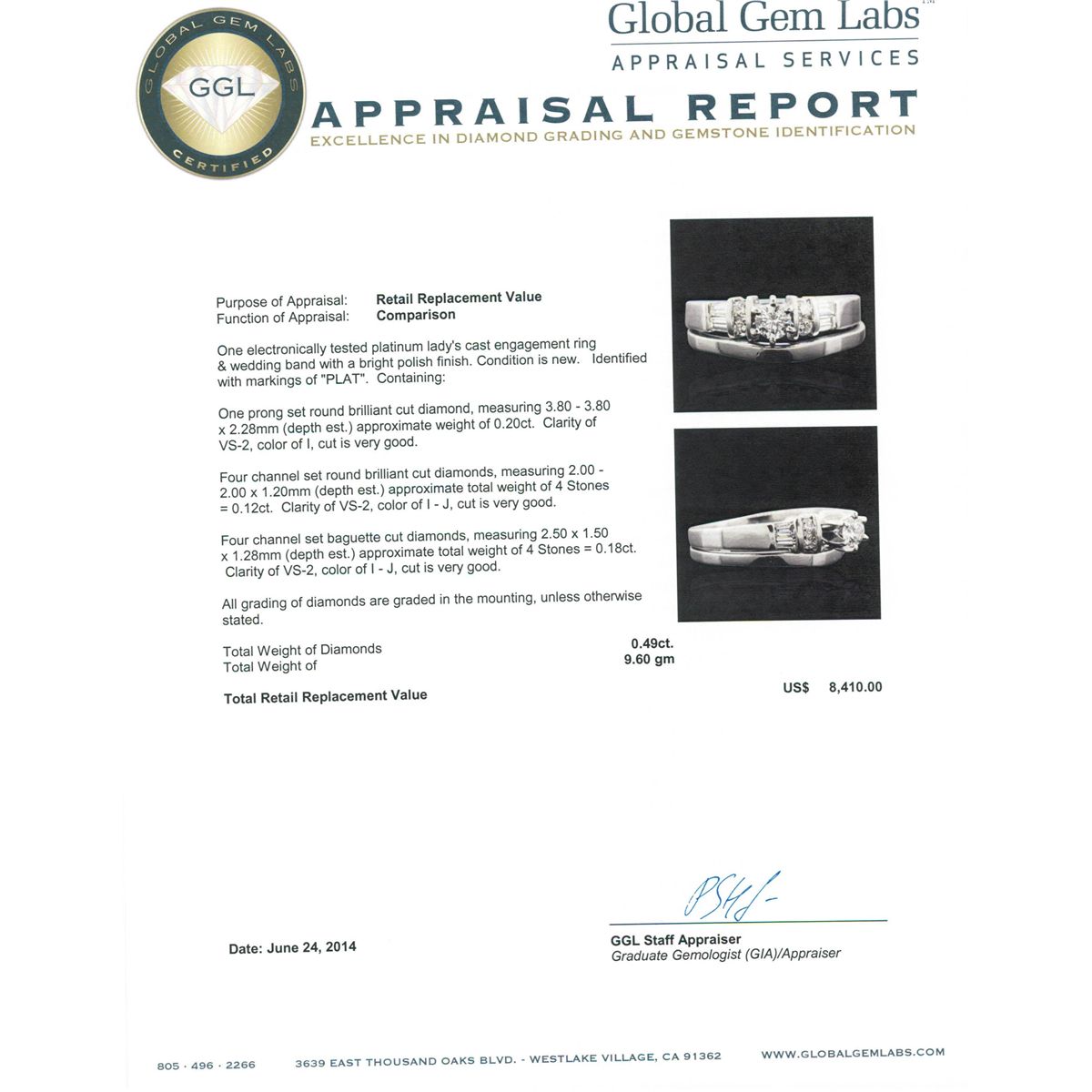 One electronically tested platinum Ladies cast engagement ring & wedding band with a bright polish finish. Condition is new. Identified with markings of "PLAT". Containing: One prong set round brilliant cut diamond, measuring 3.80 - 3.80 x 2.28mm (depth est.) approximate weight of 0.20ct. Clarity: VS-2. Color: I, Cut is Very Good. Four channel set round brilliant cut diamonds, measuring 2.00 - 2.00 x 1.20mm (depth est.) approximate. Total Weight of 4 Stones = 0.12ct. Clarity: VS-2. Color: I - J, Cut is Very Good. Four channel set baguette cut diamonds, measuring 2.50 x 1.50 x 1.28mm (depth est.) approximate. Total Weight of 4 Stones = 0.18ct. Clarity: VS-2. Color: I - J, Cut is Very Good. All grading of diamonds are graded in the mounting, unless otherwise stated. Total Weight of Diamonds 0.49ct. Total Weight of 9.60 grams. GGL Appraised at $8,410.00.