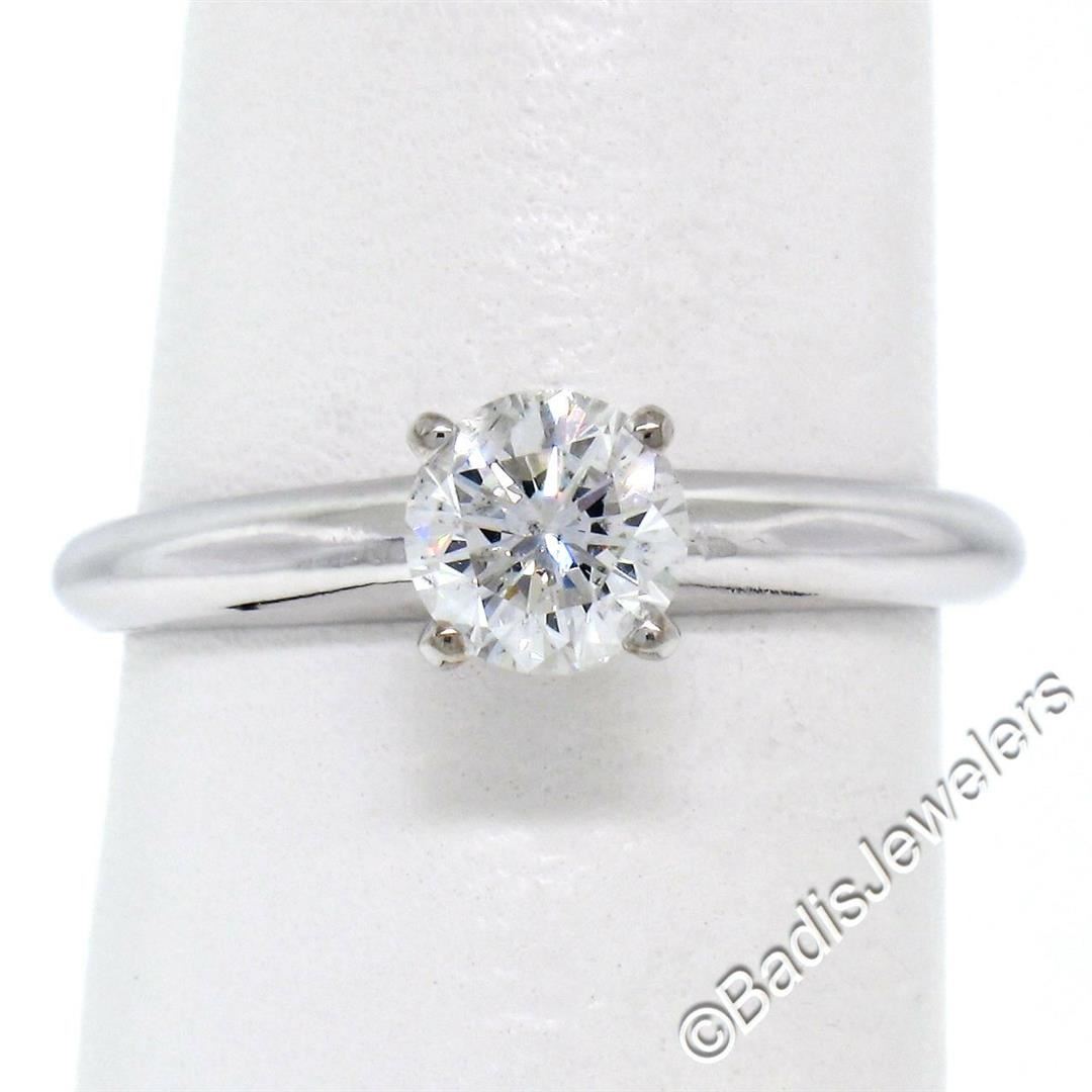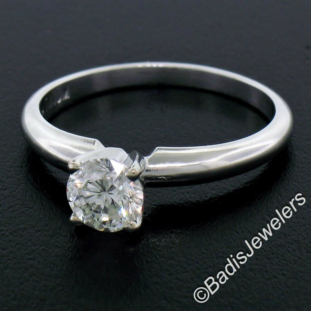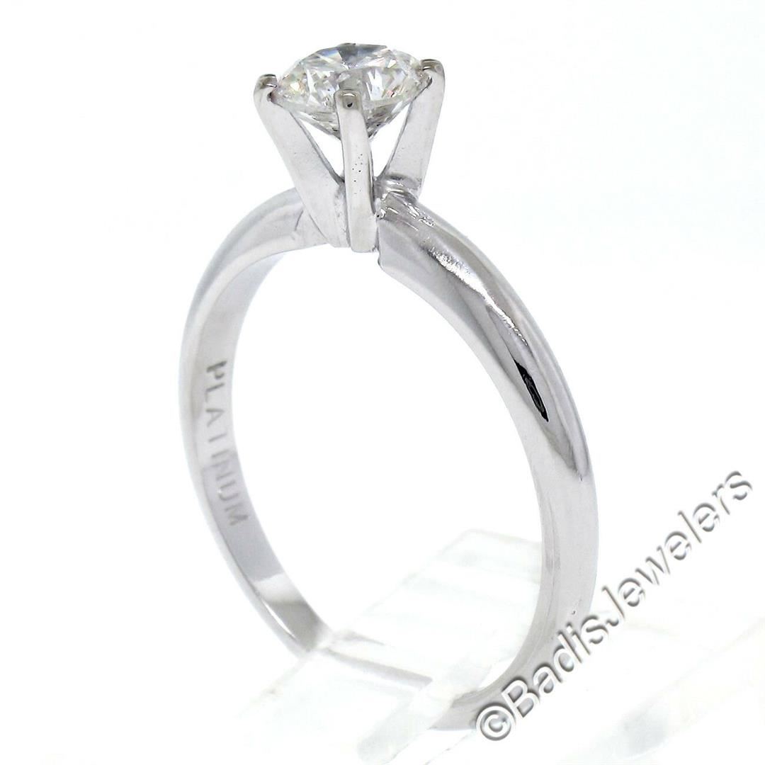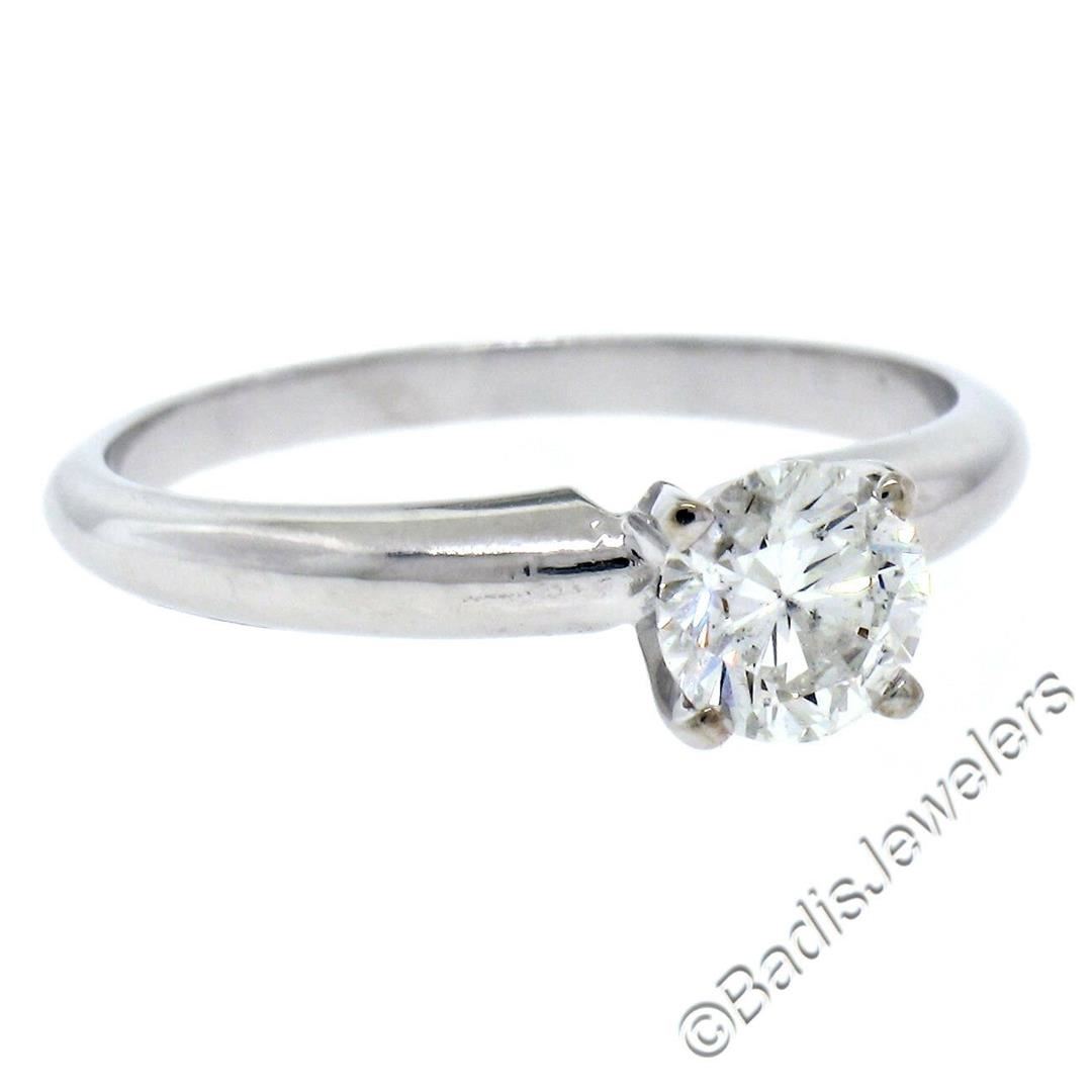A platinum 0.60ct round brilliant diamond (G - SI2) solitaire engagement ring. The ring is size 6.0, weighs a total of 3.59 grams, and measures 5.35mm wide.