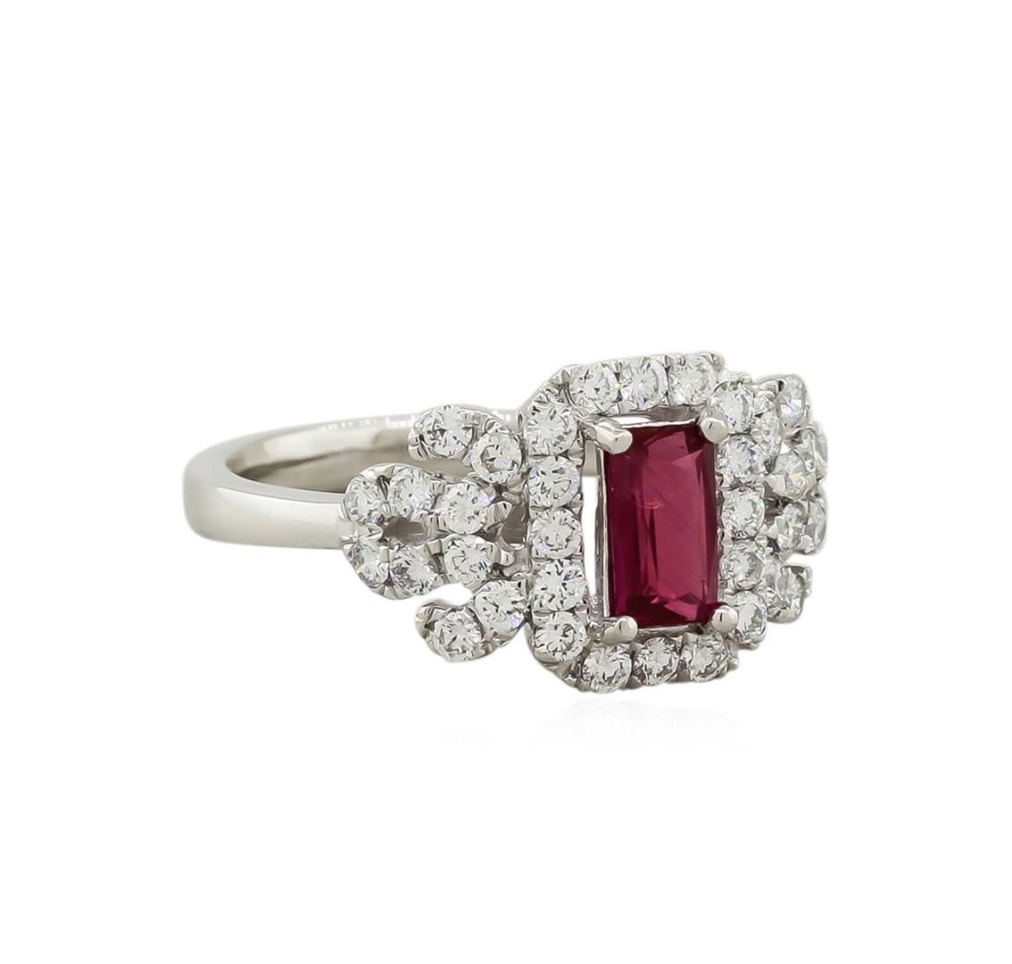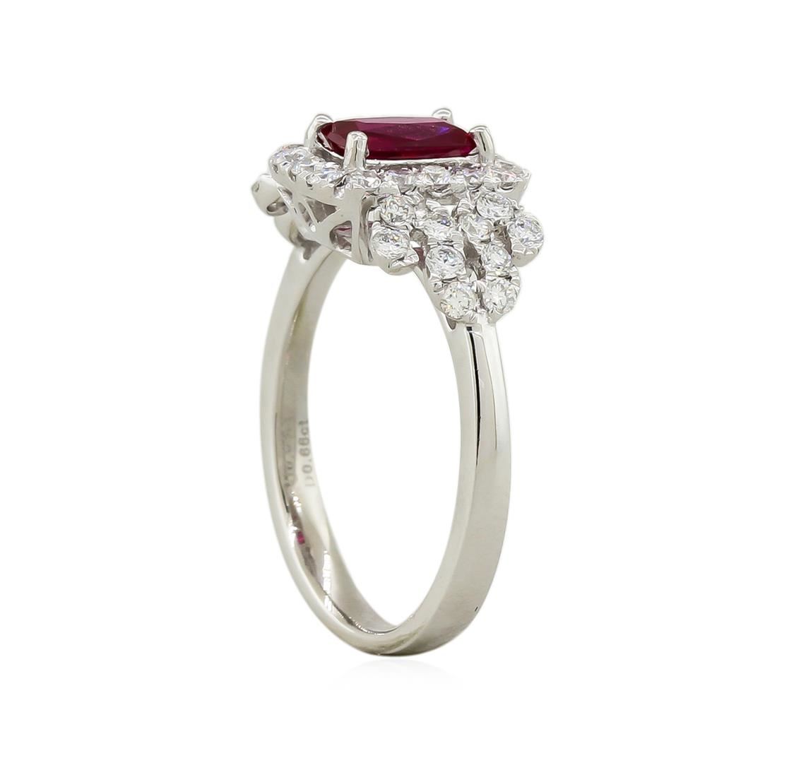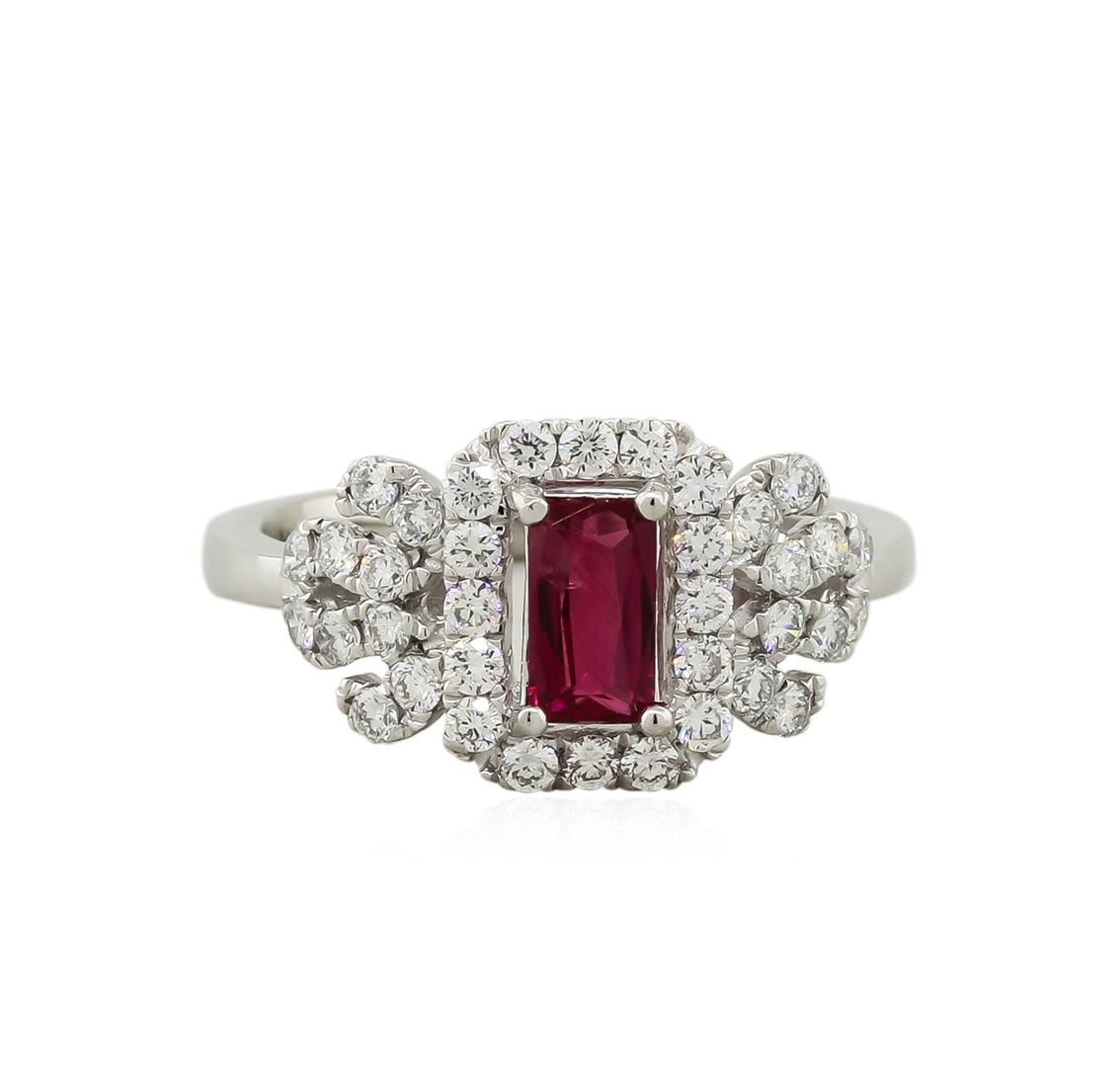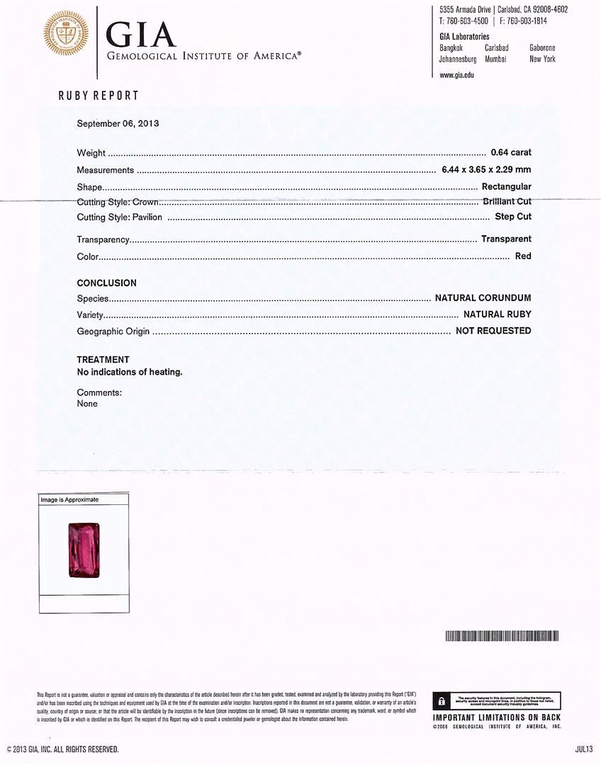 One electronically tested platinum ladies cast ruby and diamond ring with a bright polish finish. The featured ruby is set within a diamond bezel between mirroring diamond galleries, completed by a two millimeter wide band. Trademark is Orianne. Identified with markings of "950". Condition is new, good workmanship. Containing: One prong set rectangular mixed cut natural ruby, measuring 6.44 x 3.65 x 2.29mm, exact weight 0.64ct., clarity is slightly included, type II, medium dark, very slightly brownish, red color, (GIA R 6/3), cut is good. Transmitting light with a minimum of distortion, transparent. Naturally occurring internal & external characteristics are present. No indications of heating. GIA Gemological Report attached. Graded loose prior to setting in the GIA Laboratory, Report # 5151624571.Thirty-Six prong set round brilliant cut diamonds approximate. Total Weight of 36 Stones = 0.66ct. Graded in the setting. Clarity: VS-1 to VS-2. Color: D - E. Total Weight of Colored Stones 0.64ct. Total Weight of Diamonds 0.66ct. Total Weight of Ring 5.89gm. AIG Appraised at $6,550.00.