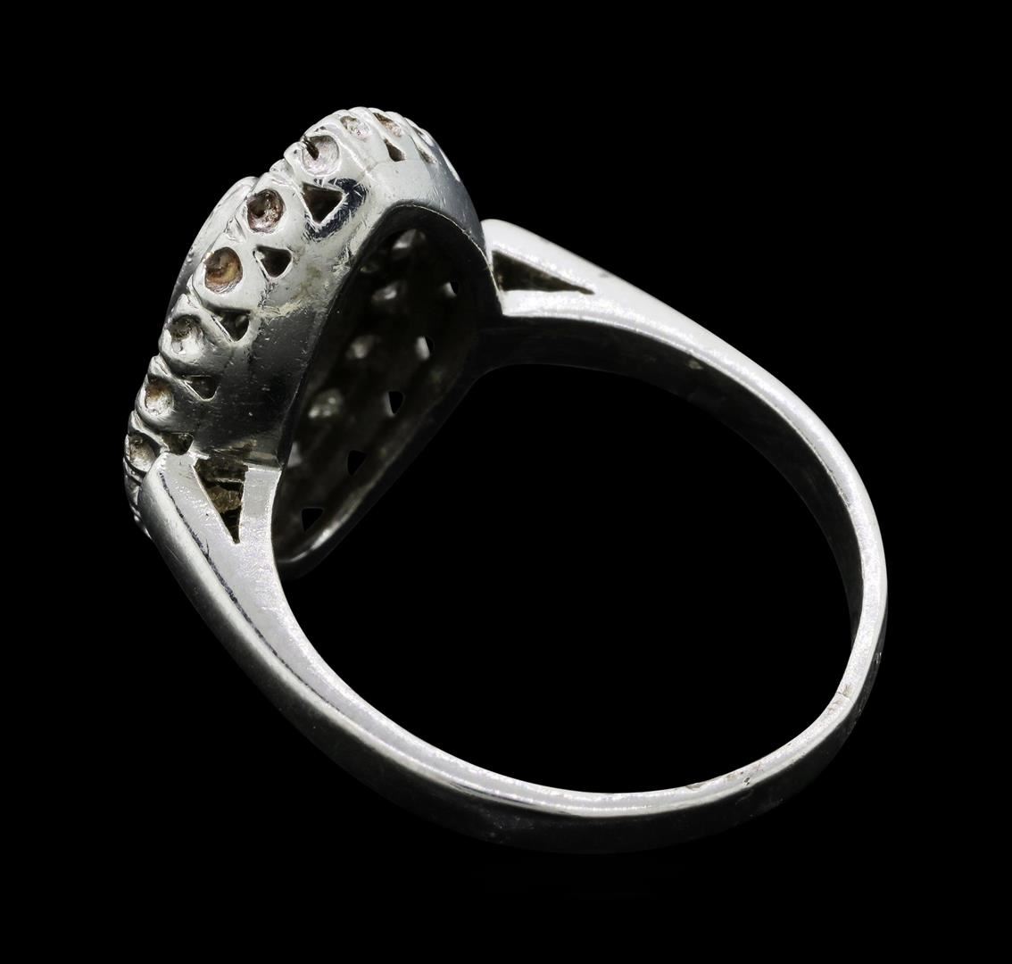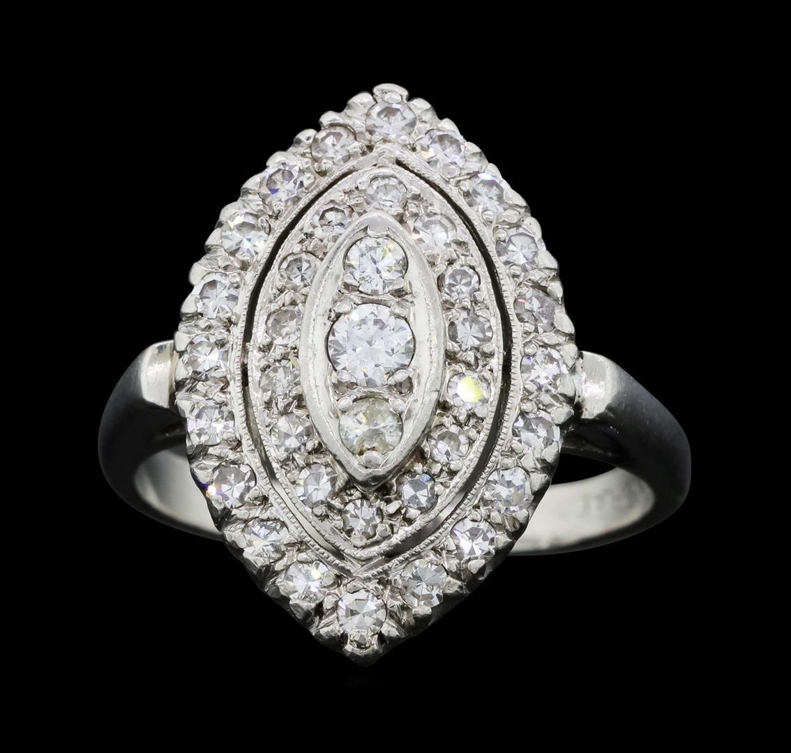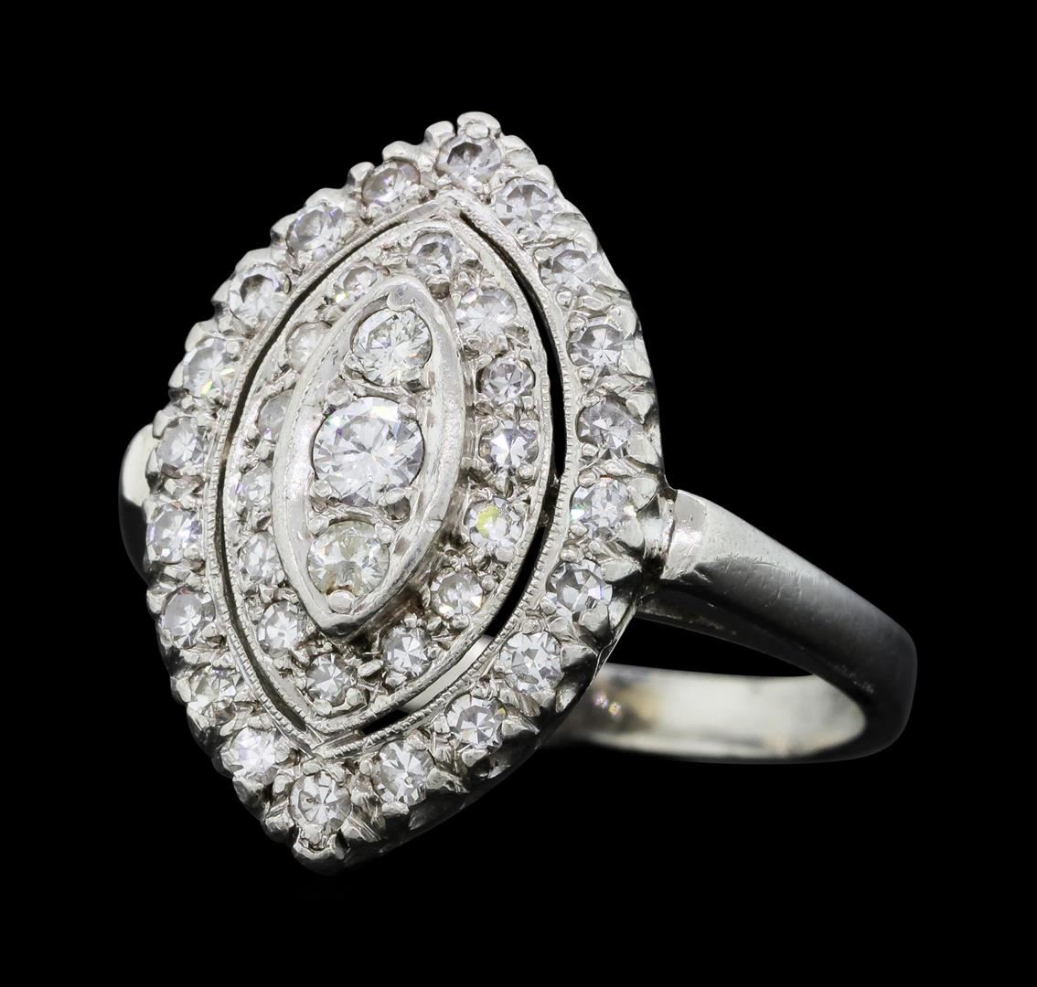 One electronically tested platinum ladies cast & assembled diamond ring. Condition is good. The ring features a diamond trio set within an inner diamond bezel and an outer diamond bezel supported by a lattice under gallery, completed by a two millimeter wide band. Bright polish finish with milgrain detailing. Identified with markings of 10% IRID PLAT". Containing One prong set round brilliant cut diamond, measuring 2.80-2.70 x 1.65mm (depth est.) approximate weight of 0.08ct. Graded in the setting. Clarity: SI-1 and color of G. Two prong set round brilliant cut diamonds, measuring 2.00 - 2.00 x 1.20mm (depth est.) approximate total weight if 2 stones = 0.07ct Graded in the setting. Clarity SI-1 to SI-1 and color H-I. Twenty prong set single cut diamonds, measuring 1.60 - 1.50 x 0.93mm (depth est.) approximate total weight of 20 stones =0.32ct. Graded in the setting. Clarity of SI-1 to SI-2 and color of G-I. Fourteen prong set single cut diamonds, measuring 1.40 - 1.30 x 0.81mm (depth est.) approximate total weight of 14 stones = 0.17ct, Graded in the setting. Clarity of SI-1 to SI-2 and color of G-I. Total weight of diamonds is 0.64cts. Total weight of the ring is 7.09gm. AIG Appraised.