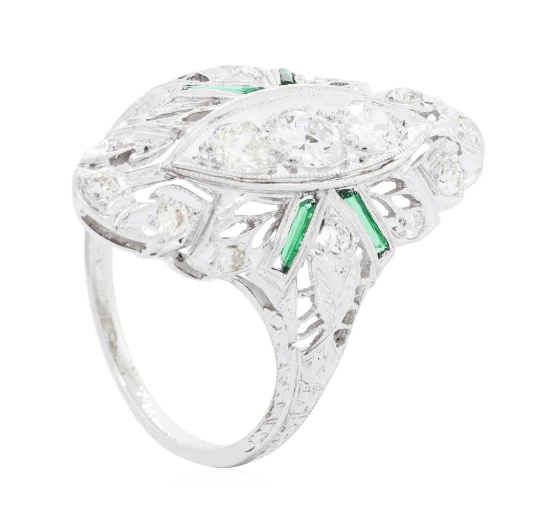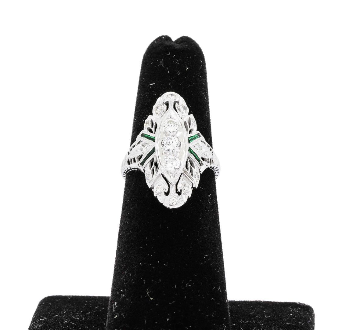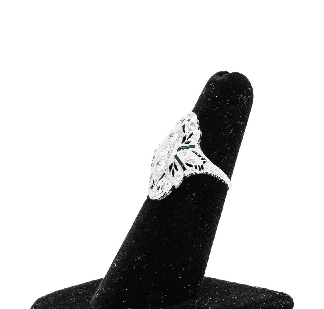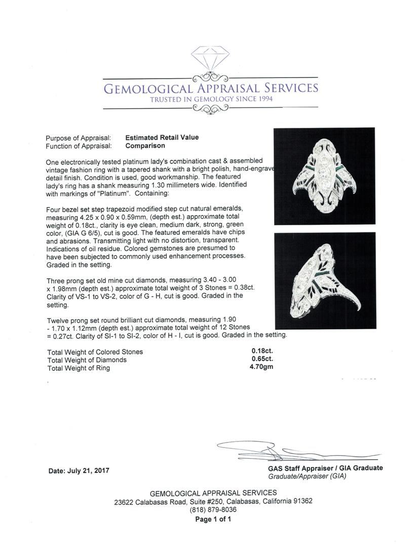 One electronically tested platinum Ladies combination cast & assembled vintage fashion ring with a tapered shank with a bright polish, hand-engraved detail finish. The featured Ladies ring has a shank measuring 1.30 millimeters wide. Identified with markings of 'Platinum'. Condition is used, good workmanship. Containing: Four bezel set step trapezoid modified step cut natural emeralds, measuring 4.25 x 0.90 x 0.59mm, (depth est.) approximate total weight of 0.18ct., clarity is eye clean, medium dark, strong, green color, (GIA G 6/5), cut is good. The featured emeralds have chips and abrasions. Transmitting light with no distortion, transparent. Indications of oil residue. Colored gemstones are presumed to have been subjected to commonly used enhancement processes. Graded in the setting. Three prong set old mine cut diamonds, measuring 3.40 - 3.00 x 1.98mm (depth est.) approximate total weight of 3 Stones = 0.38ct. Graded in the setting. Color G - H Clarity VS-1 to VS-2 Cut Good Twelve prong set round brilliant cut diamonds, measuring 1.90 - 1.70 x 1.12mm (depth est.) approximate total weight of 12 Stones = 0.27ct. Graded in the setting. Color H - I Clarity SI-1 to SI-2 Cut Good. Total Weight of Colored Stones 0.18ct. Total Weight of Diamonds 0.65ct. Total Weight of Ring 4.70gm. GAS Appraised.
