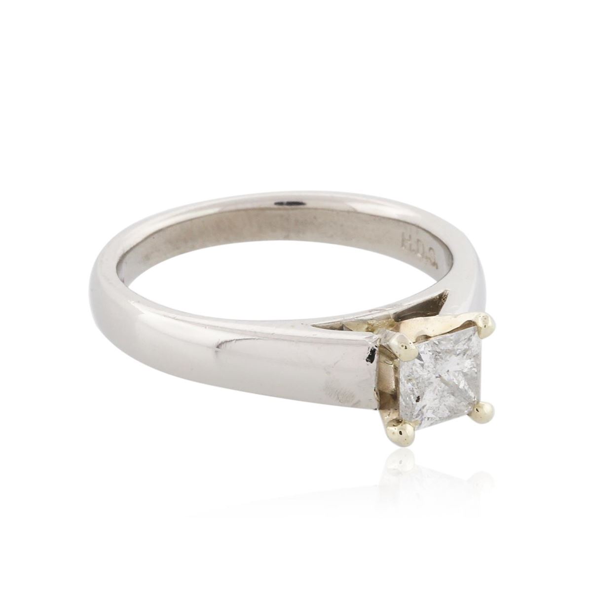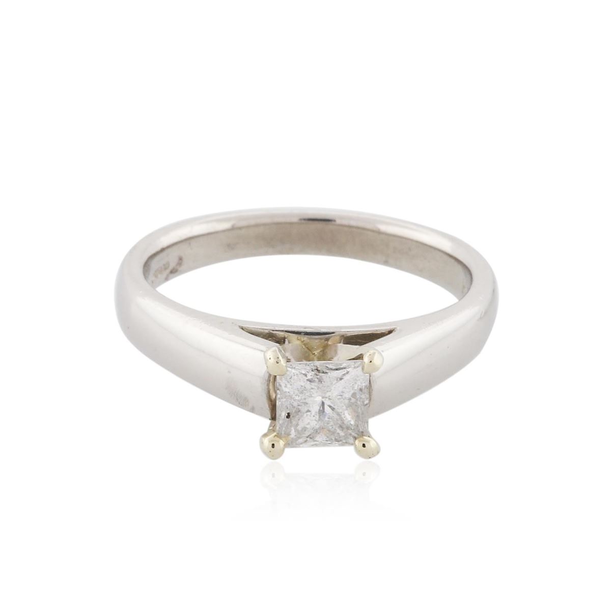 One electronically tested platinum ladies cast & assembled diamond solitaire ring. Condition is new, good workmanship. The featured diamond is set within a yellow gold basket supported by tapering shoulders, completed by a two and one-half millimeter wide band. Bright polish finish. Identified with markings of "PT 900". Containing: One prong set princess cut diamond, measuring 4.70 x 4.65 x 3.90mm (depth est.) approximate weight of 0.70ct with a faint blue fluorescence. Graded in the setting. Clarity: I-1. Color: 83.9%. Table 79.6%. Total Weight of Diamonds 0.70ct. Total Weight of Ring 7.17 grams. AIG Appraised at $5,770.00.