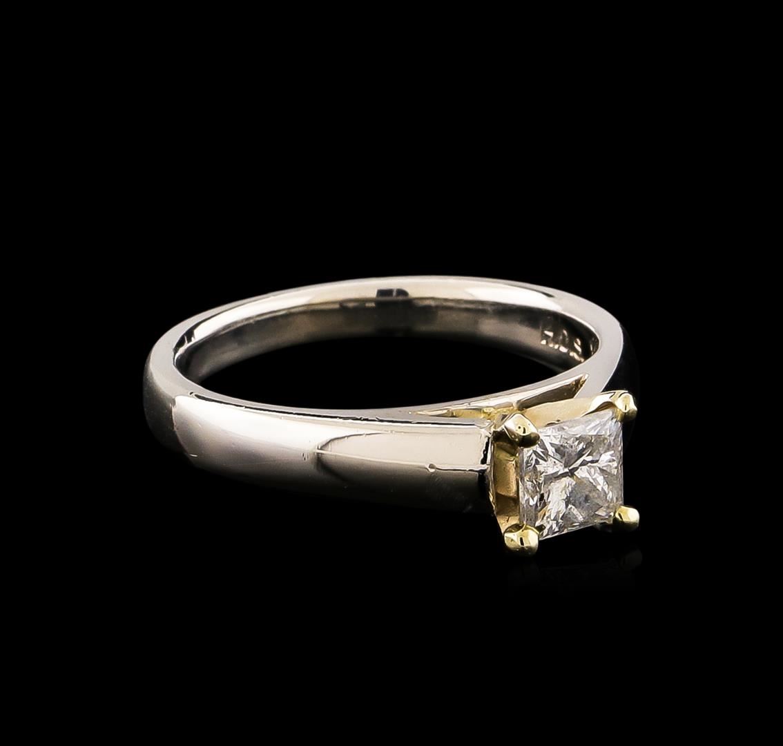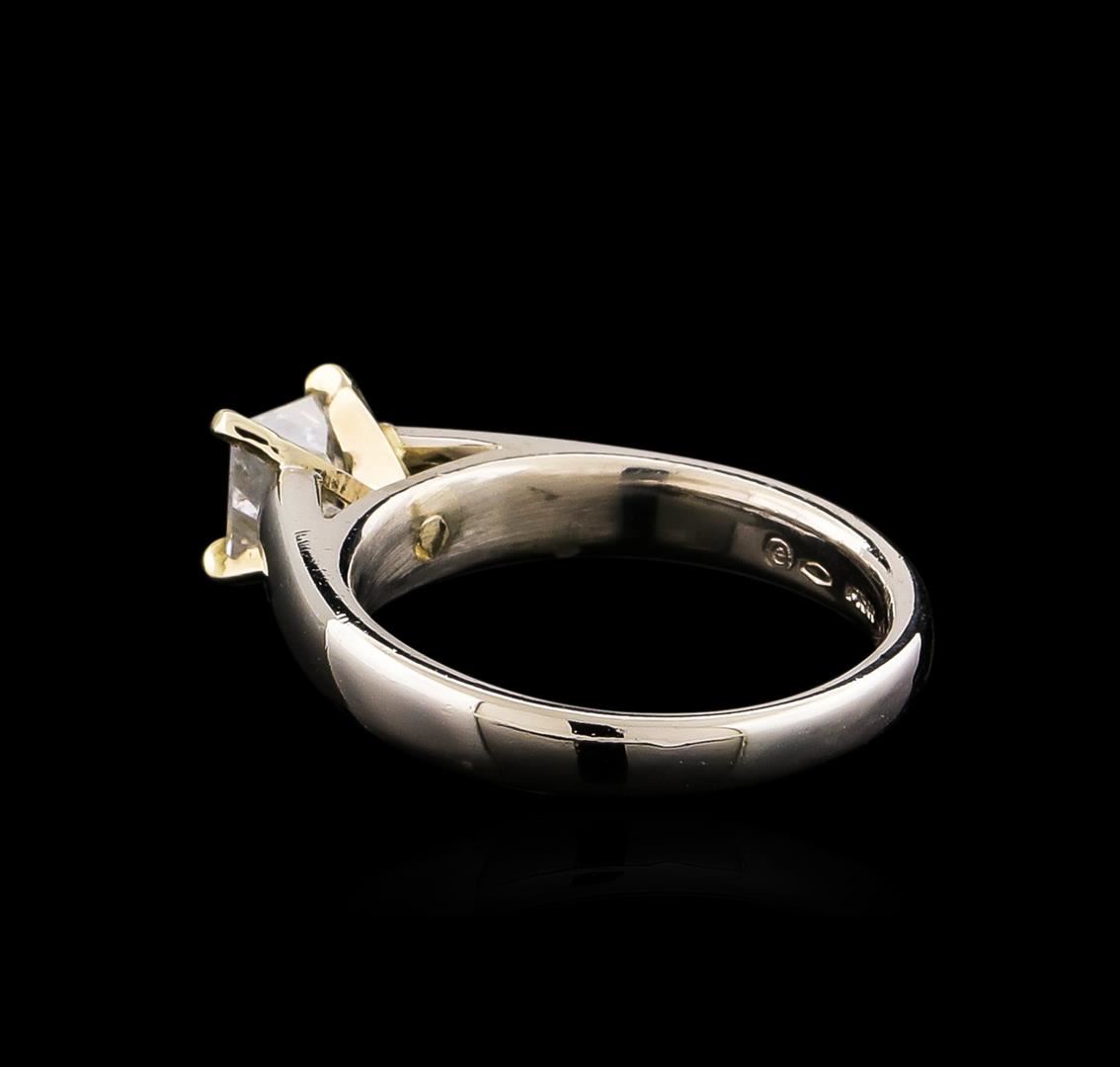 One electronically tested platinum ladies cast & assembled diamond solitaire ring. Condition is new, good workmanship. The featured diamond is set within a yellow gold basket supported by tapering shoulders, completed by a two and one-half millimeter wide band. Bright polish finish. Identified with markings of "PT 900". Containing: One prong set princess cut diamond, measuring 4.70 x 4.65 x 3.90mm (depth est.) approximate weight of 0.70ct with a faint blue fluorescence. Graded in the setting. Clarity: I-1. Color: 83.9%. Table 79.6%. Total Weight of Diamonds 0.70ct. Total Weight of Ring 7.17 grams. AIG Appraised at $5,770.00.