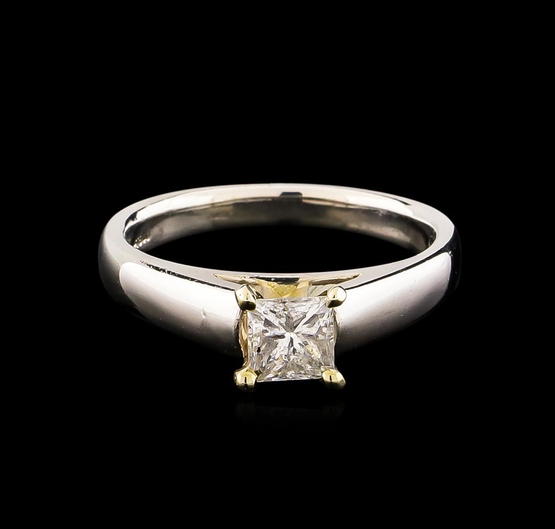 One electronically tested platinum ladies cast & assembled diamond solitaire ring. Condition is new, good workmanship. The featured diamond is set within a yellow gold basket supported by tapering shoulders, completed by a two and one-half millimeter wide band. Bright polish finish. Identified with markings of "PT 900". Containing: One prong set princess cut diamond, measuring 4.70 x 4.65 x 3.90mm (depth est.) approximate weight of 0.70ct with a faint blue fluorescence. Graded in the setting. Clarity: I-1. Color: 83.9%. Table 79.6%. Total Weight of Diamonds 0.70ct. Total Weight of Ring 7.17 grams. AIG Appraised at $5,770.00.