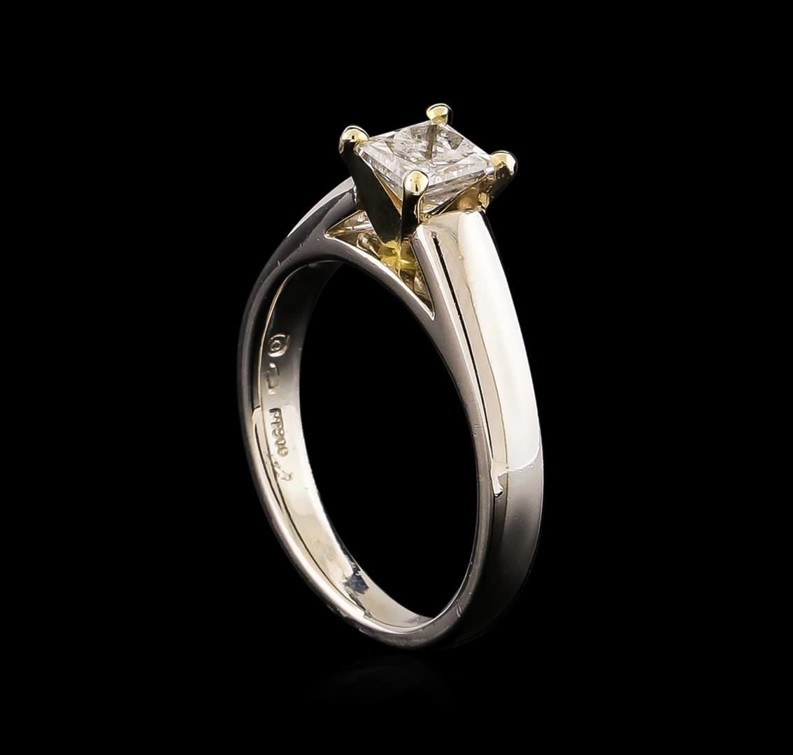 One electronically tested platinum ladies cast & assembled diamond solitaire ring. Condition is new, good workmanship. The featured diamond is set within a yellow gold basket supported by tapering shoulders, completed by a two and one-half millimeter wide band. Bright polish finish. Identified with markings of "PT 900". Containing: One prong set princess cut diamond, measuring 4.70 x 4.65 x 3.90mm (depth est.) approximate weight of 0.70ct with a faint blue fluorescence. Graded in the setting. Clarity: I-1. Color: 83.9%. Table 79.6%. Total Weight of Diamonds 0.70ct. Total Weight of Ring 7.17 grams. AIG Appraised.
