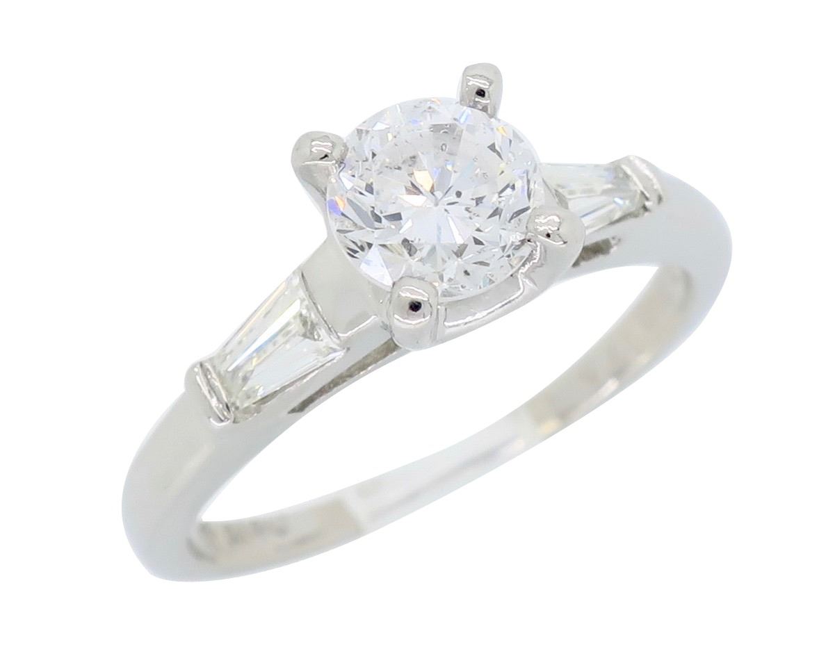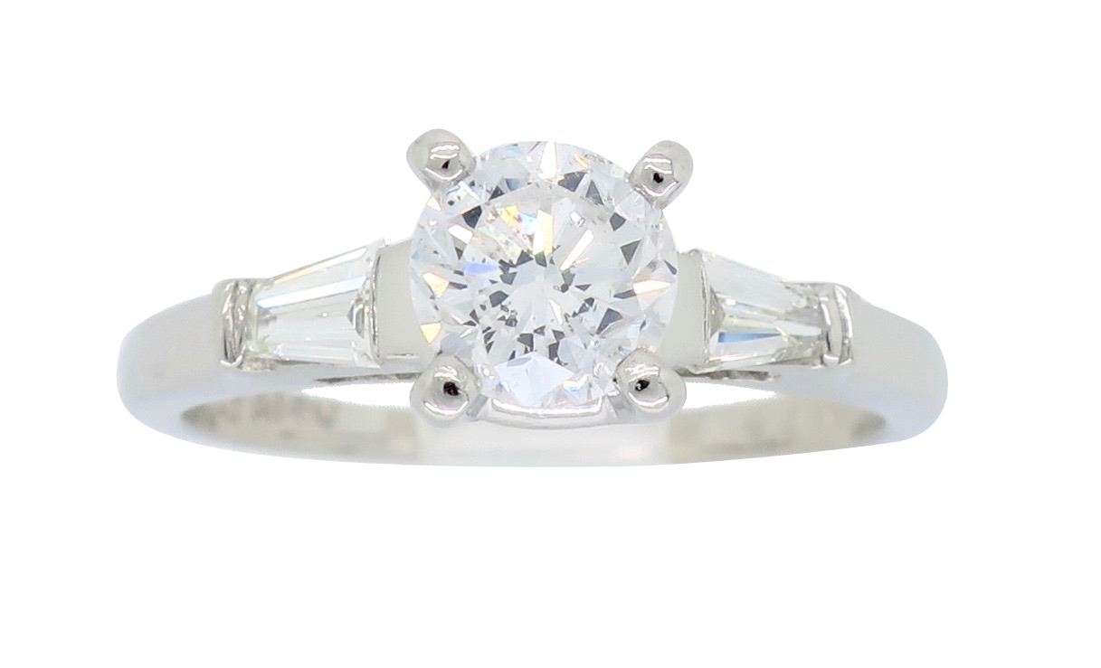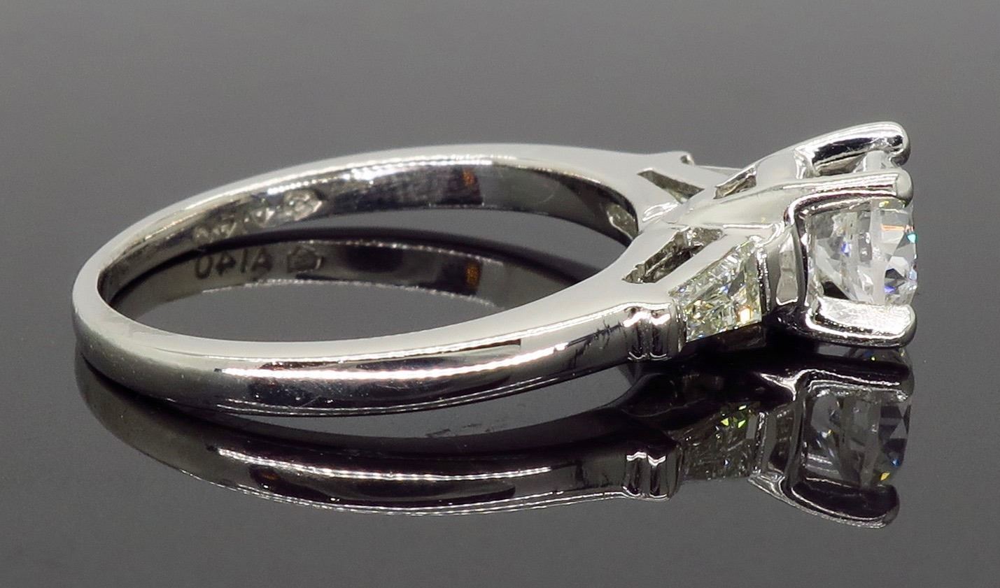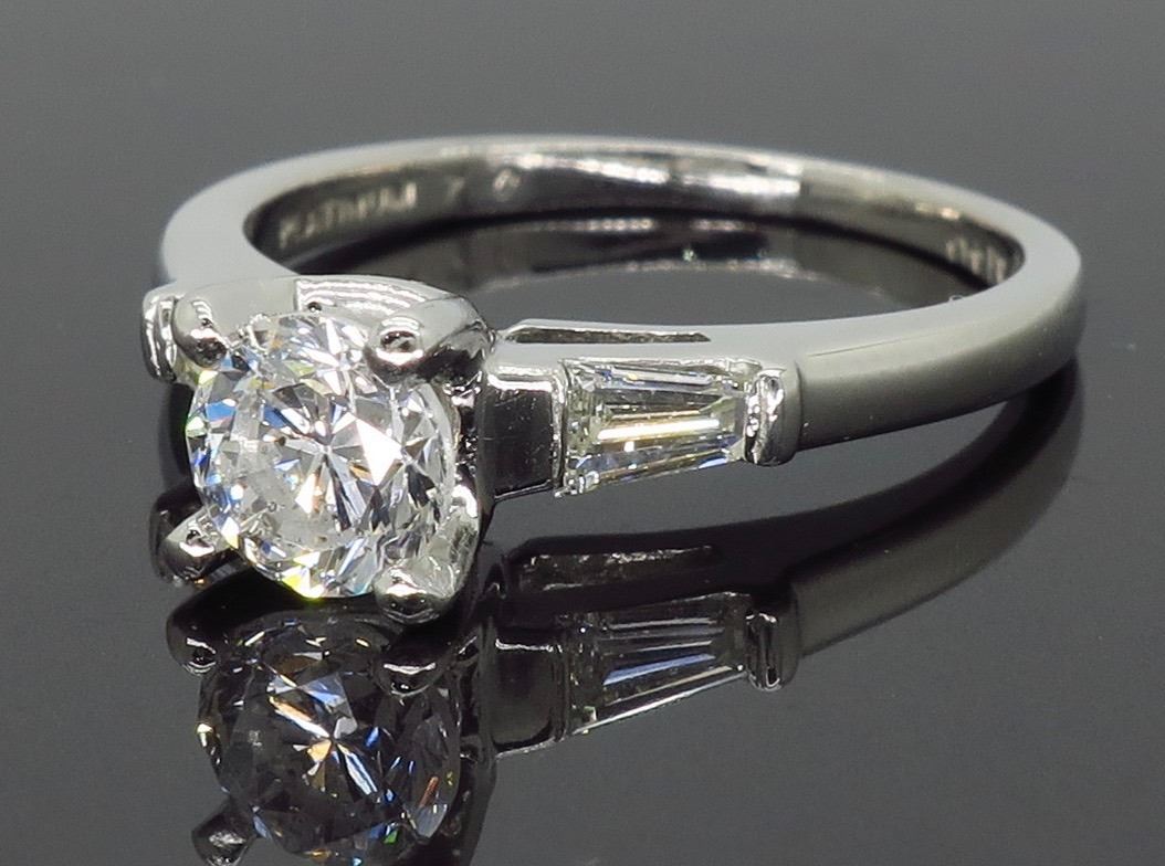 One Platinum 0.75ctw Diamond Ring. (1) Round Diamond with a total weight of 0.55cts with a color of F-G and clarity of SI-2. (2) tapered baguette Diamonds with a total weigth of 0.20cts. Total weight of this ring is 4.5 grams. Ring size is 5.75.