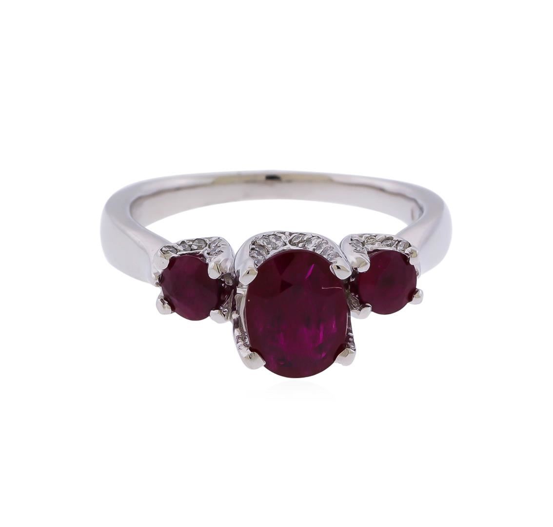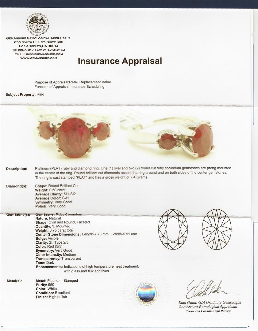 Platinum (PLAT) ruby and diamond ring. One (1) oval and two (2) round cut ruby corundum gemstones, with a total approximate weight of .75ctw, and are prong mounted the center of the ring. Surrounded by round brilliant cut diamonds, weighing approximately 0.50ctw with an average clarity of SI1-SI2, and an average color G-H, accent he ring around and both sides of the center gemstones. The ring is cast stamped "PLAT" and has a weight of 7.4 Grams. GGA Appraised.