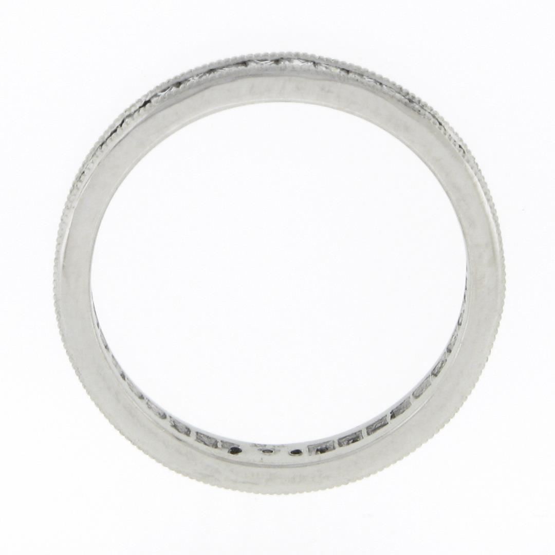 A solid platinum band ring, with 40 princess cut natural diamonds (F/G - VVS2/VS1 ; 0.77ctw). The ring is size 6.0, weighs a total of 2.80 grams, and measures 2.7mm wide.