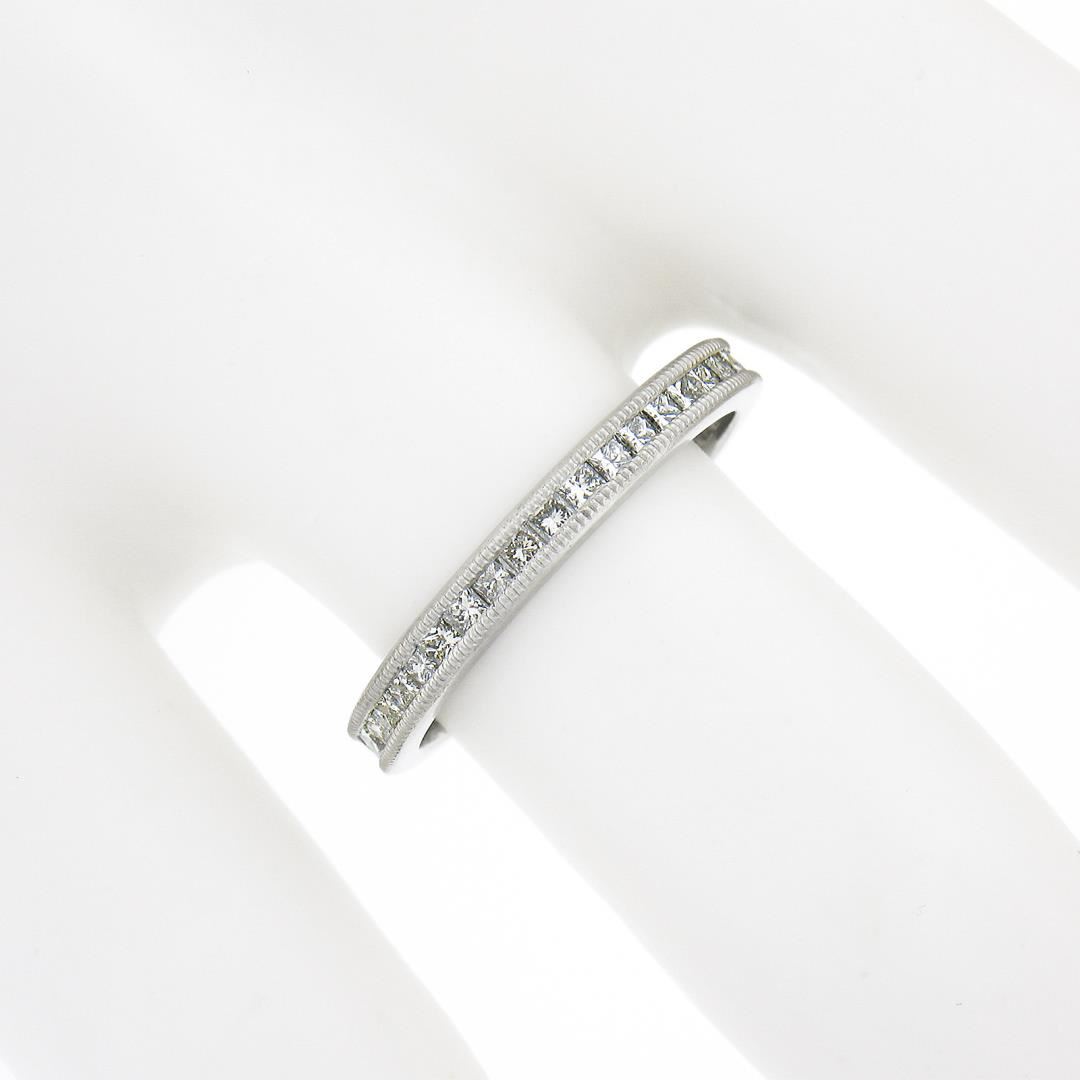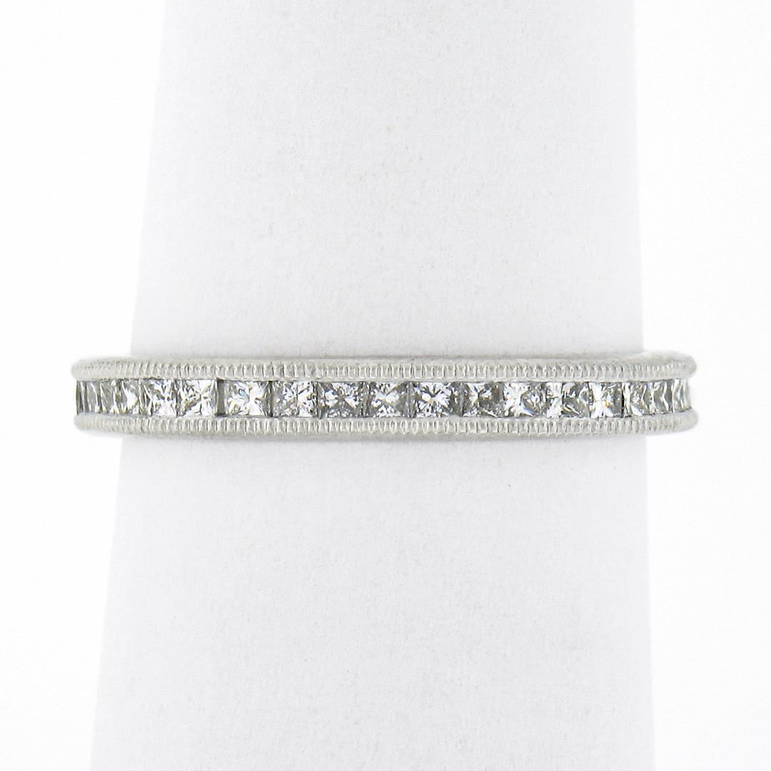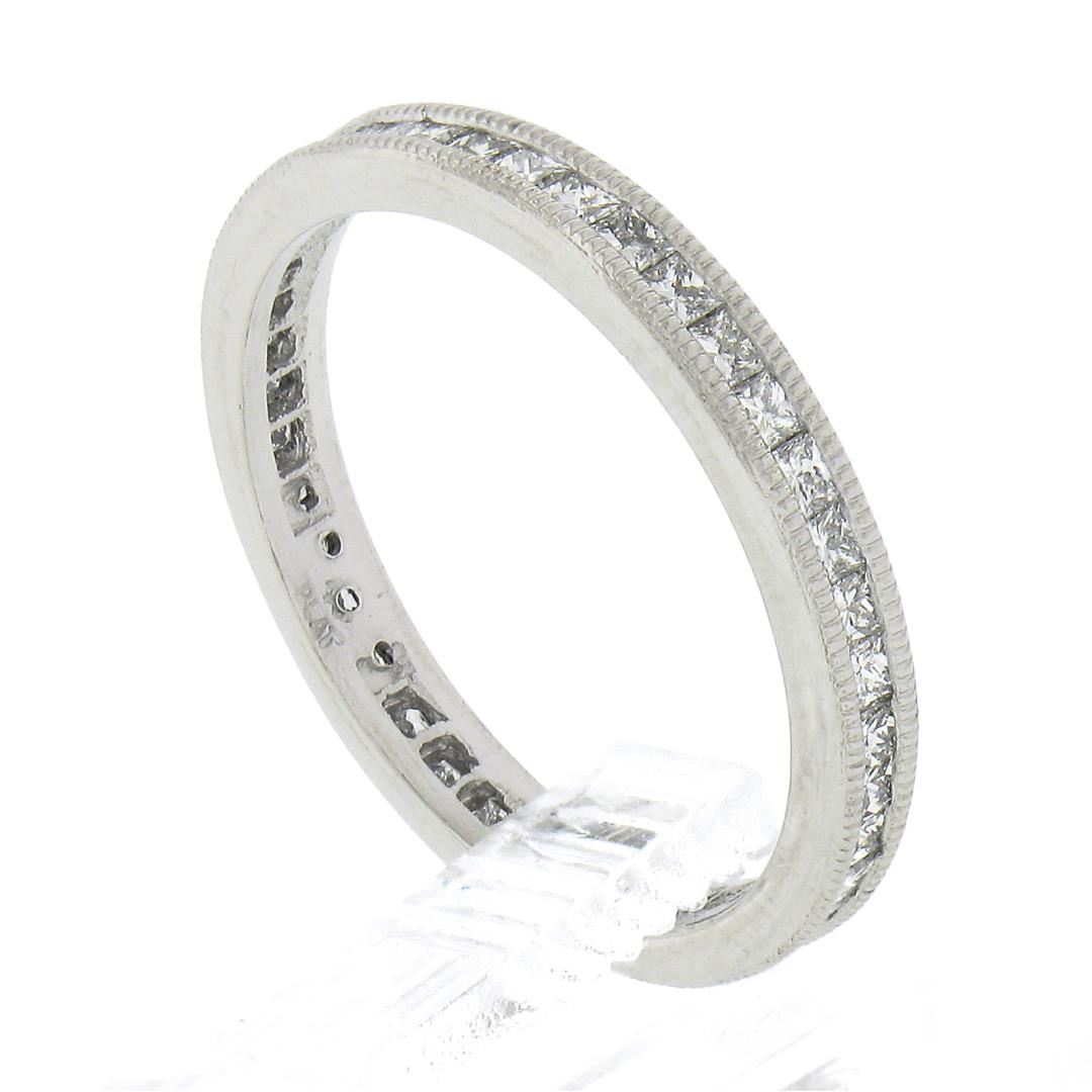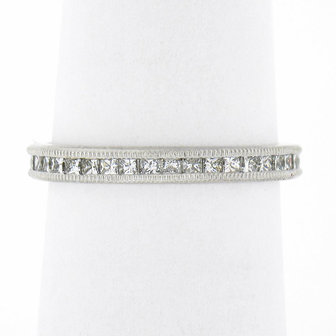 A solid platinum band ring, with 40 princess cut natural diamonds (F/G - VVS2/VS1 ; 0.77ctw). The ring is size 6.0, weighs a total of 2.80 grams, and measures 2.7mm wide.