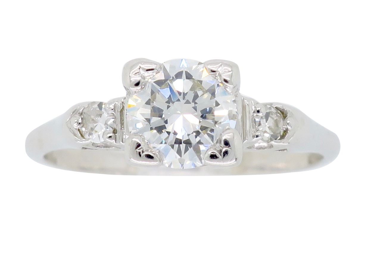 One Platinum 0.82ctw Diamond Ring. (1) Round Center Diamond with a total weight of 0.72cts with a color of H-I and clarity of VS-2. (2) side Diamonds with a total weight of 0.10cts. Total weight of this ring is 3.9 grams. Ring size is 6.25.