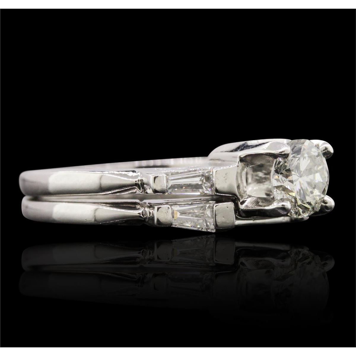 One electronically tested platinum Ladies combination cast & assembled engagement ring & wedding band with a bright polish finish. Condition is very good. Identified with markings of "PLAT". Containing: One prong set round brilliant cut diamond, measuring 5.45 - 5.45 x 3.40mm (depth est.) approximate weight of 0.62ct. Clarity: I-1. Color: K, Cut is Very Good. Four prong set baguette cut diamonds, measuring 3.20 x 1.50 x 1.28mm (depth est.) approximate. Total Weight of 4 Stones = 0.23ct. Clarity: VS-2. Color: H, Cut is Good. All diamonds are graded in the mounting, unless otherwise stated. Total Weight of Diamonds 0.84ct. Total Weight of Engagement Ring & Wedding Band 9.10 grams.. GGL Appraised at $10,185.00.