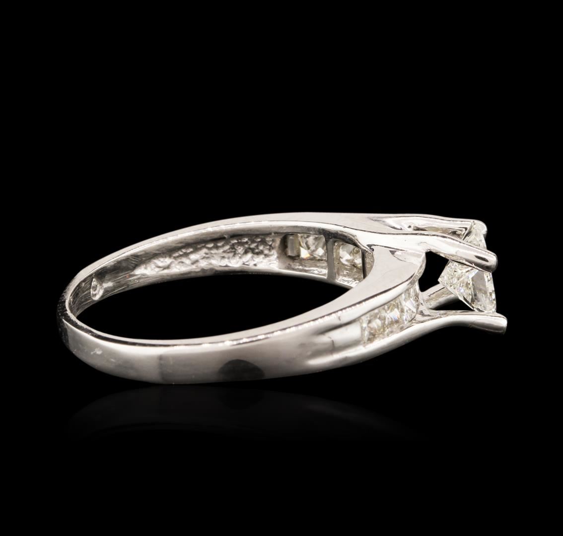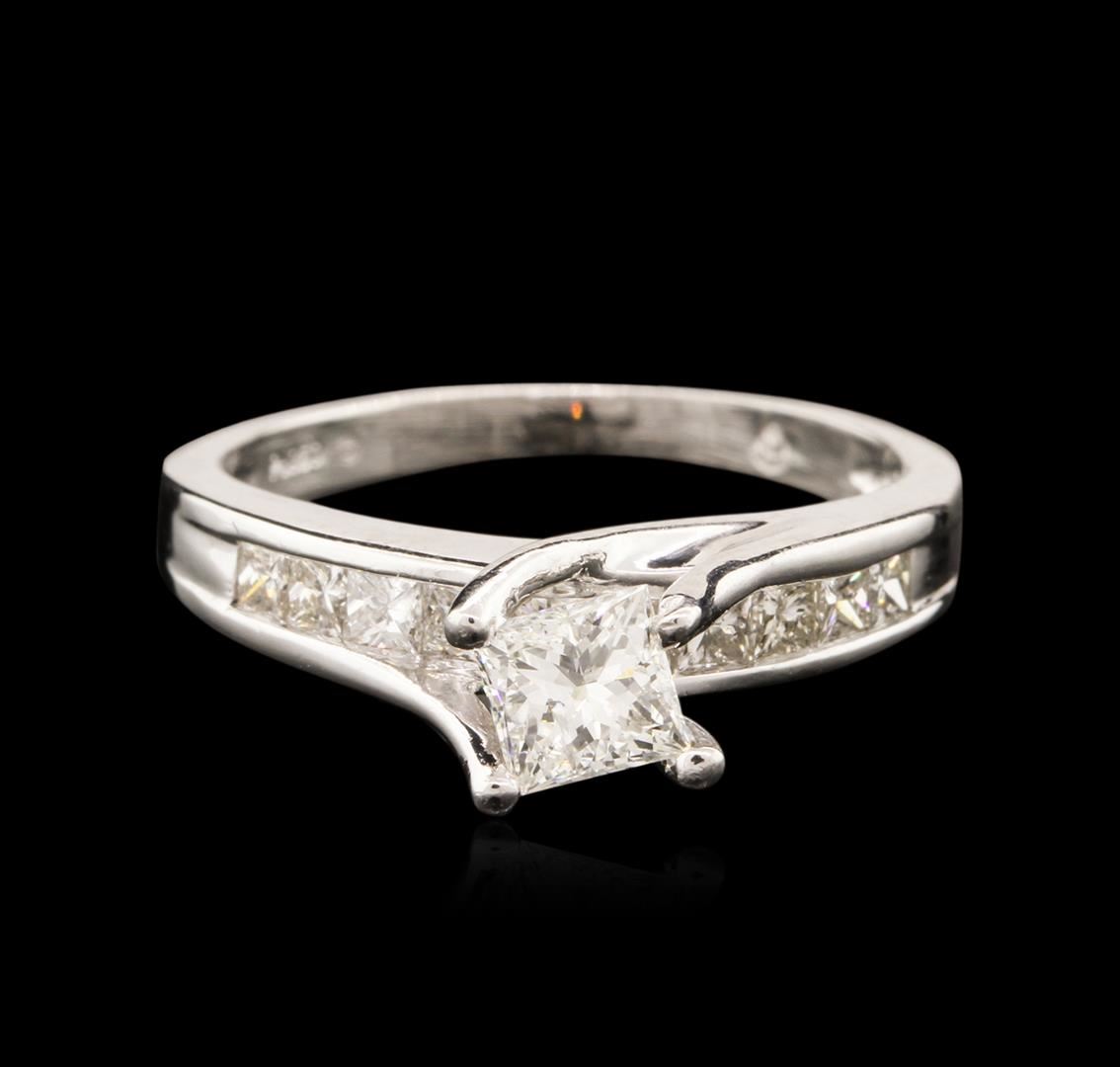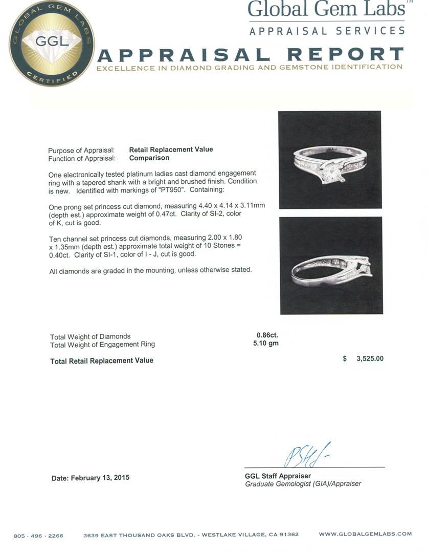 One electronically tested platinum ladies cast diamond engagement ring with a tapered shank with a bright and brushed finish. Identified with markings of "PT950". Condition is new. Containing: One prong set princess cut diamond, measuring 4.40 x 4.14 x 3.11mm (depth est.) approximate weight of 0.47ct. Clarity: SI-2. Color: K, Cut is Good. Ten channel set princess cut diamonds, measuring 2.00 x 1.80 x 1.35mm (depth est.) approximate total weight of 10 Stones = 0.40ct. Clarity: SI-1. Color: I - J, Cut is Good. All diamonds are graded in the mounting, unless otherwise stated. Total Weight of Diamonds 0.86ct. Total Weight of Engagement Ring 5.10 grams. GGL Appraised at $3,525.00.