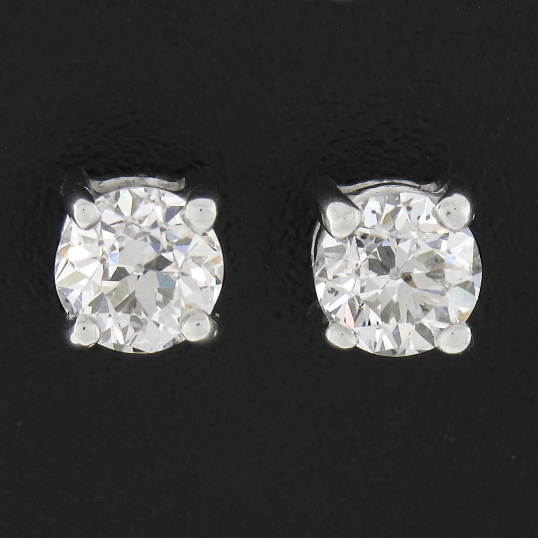 a solid platinum stud earrings, with 2 old European cut natural diamonds (G/H - VS2/SI1 ; 0.91ctw). The earrings measure approximately 6mm in diameter and weigh a total of 1.83 grams.