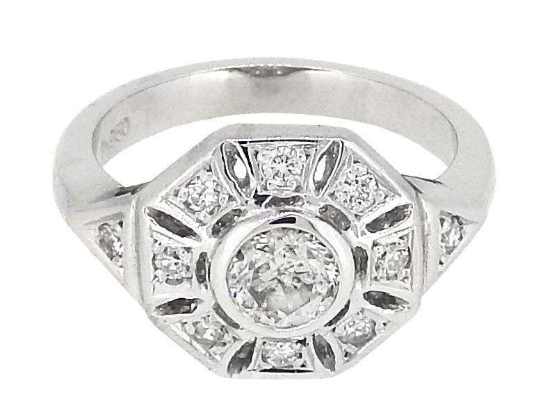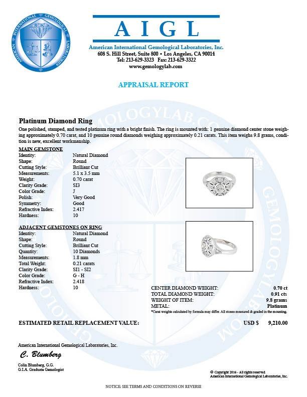 One Platinum 0.91ctw Diamond Ring. (1) Center diamond with a total weight of 0.70cts. (10) diamonds with a total weight of 0.21cts. Total weight of the ring is 9.8 grams.