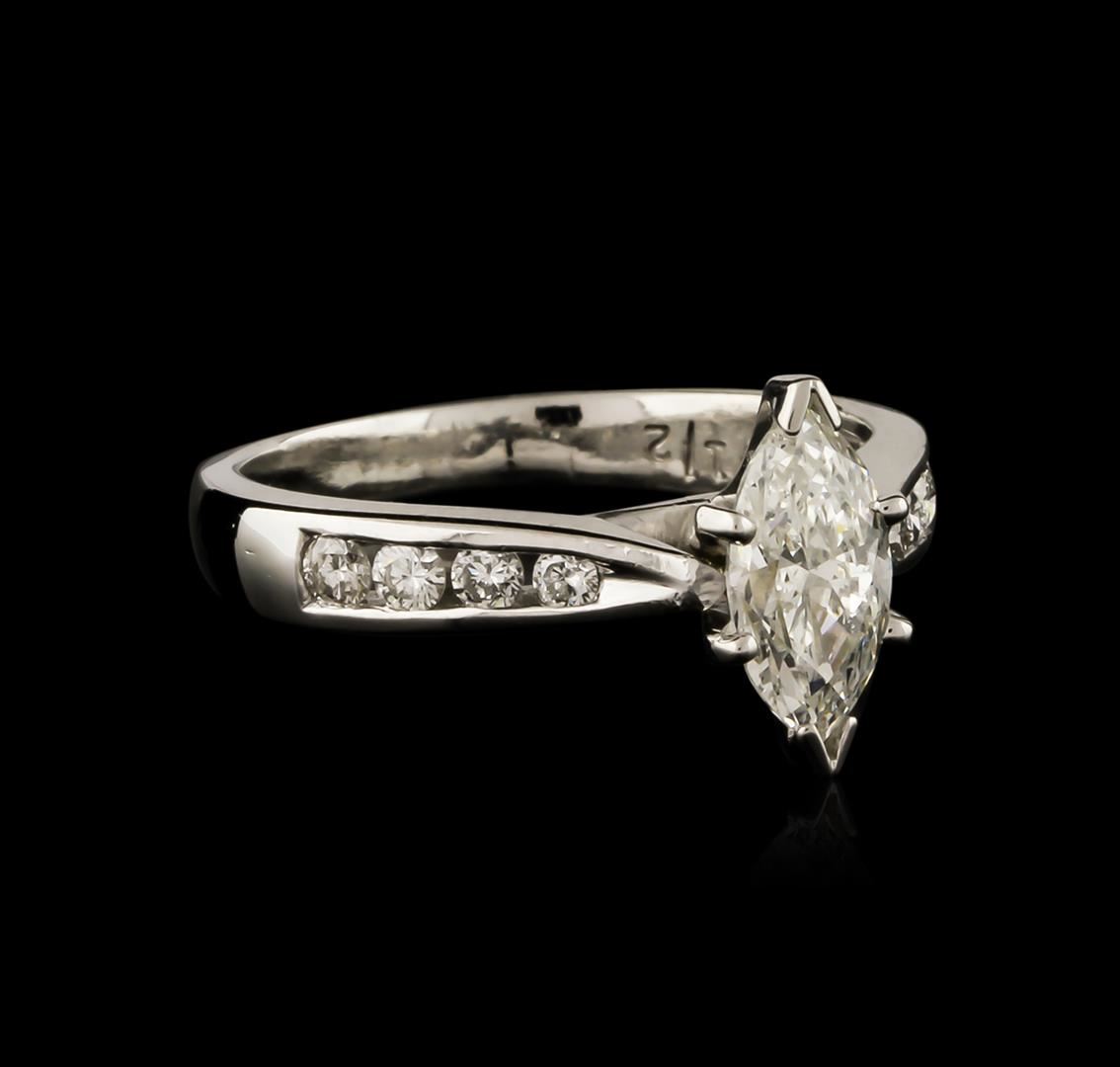One electronically tested platinum ladies cast diamond engagement ring with a bright polish finish. Identified with markings of "PT 950". Condition is new. Containing: One prong set marquise shaped cut diamond, measuring 9.50 x 4.70 x 2.96mm (depth est.) approximate weight of 0.77ct. Clarity: SI-2. Color: K. Eight channel set round brilliant cut diamonds, measuring 1.90 - 1.50 x 1.02mm (depth est.) approximate total weight of 8 Stones = 0.14ct. Clarity: SI-1 to SI-2. Color: J, Cut is Good. All diamonds are graded in the mounting, unless otherwise stated. Total Weight of Diamonds 0.92ct. Total Weight of Engagement Ring 5.00 grams. GGL Appraised at $6,750.00.