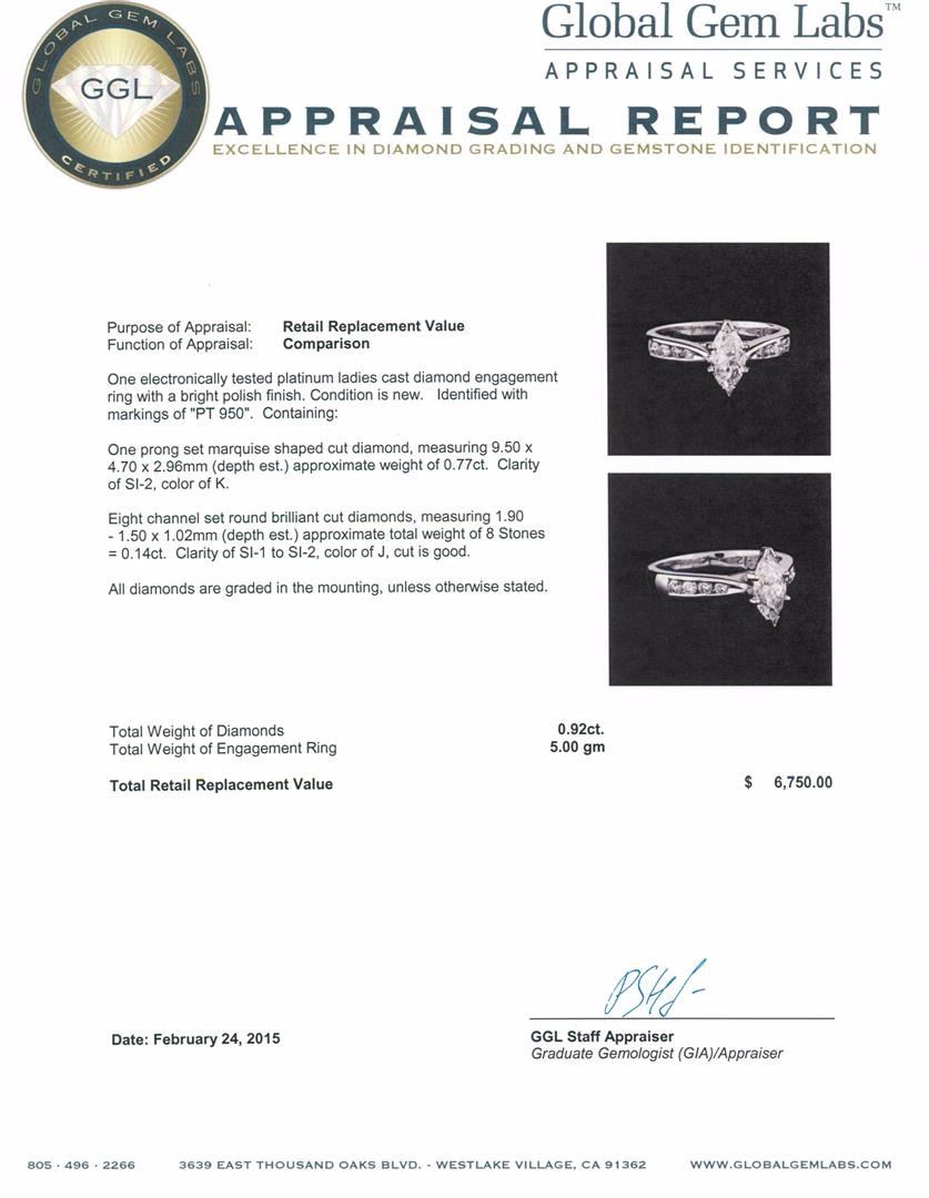 One electronically tested platinum ladies cast diamond engagement ring with a bright polish finish. Identified with markings of "PT 950". Condition is new. Containing: One prong set marquise shaped cut diamond, measuring 9.50 x 4.70 x 2.96mm (depth est.) approximate weight of 0.77ct. Clarity: SI-2. Color: K. Eight channel set round brilliant cut diamonds, measuring 1.90 - 1.50 x 1.02mm (depth est.) approximate total weight of 8 Stones = 0.14ct. Clarity: SI-1 to SI-2. Color: J, Cut is Good. All diamonds are graded in the mounting, unless otherwise stated. Total Weight of Diamonds 0.92ct. Total Weight of Engagement Ring 5.00 grams. GGL Appraised at $6,750.00.
