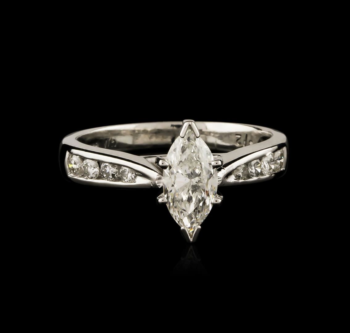 One electronically tested platinum ladies cast diamond engagement ring with a bright polish finish. Identified with markings of "PT 950". Condition is new. Containing: One prong set marquise shaped cut diamond, measuring 9.50 x 4.70 x 2.96mm (depth est.) approximate weight of 0.77ct. Clarity: SI-2. Color: K. Eight channel set round brilliant cut diamonds, measuring 1.90 - 1.50 x 1.02mm (depth est.) approximate total weight of 8 Stones = 0.14ct. Clarity: SI-1 to SI-2. Color: J, Cut is Good. All diamonds are graded in the mounting, unless otherwise stated. Total Weight of Diamonds 0.92ct. Total Weight of Engagement Ring 5.00 grams. GGL Appraised at $6,750.00.