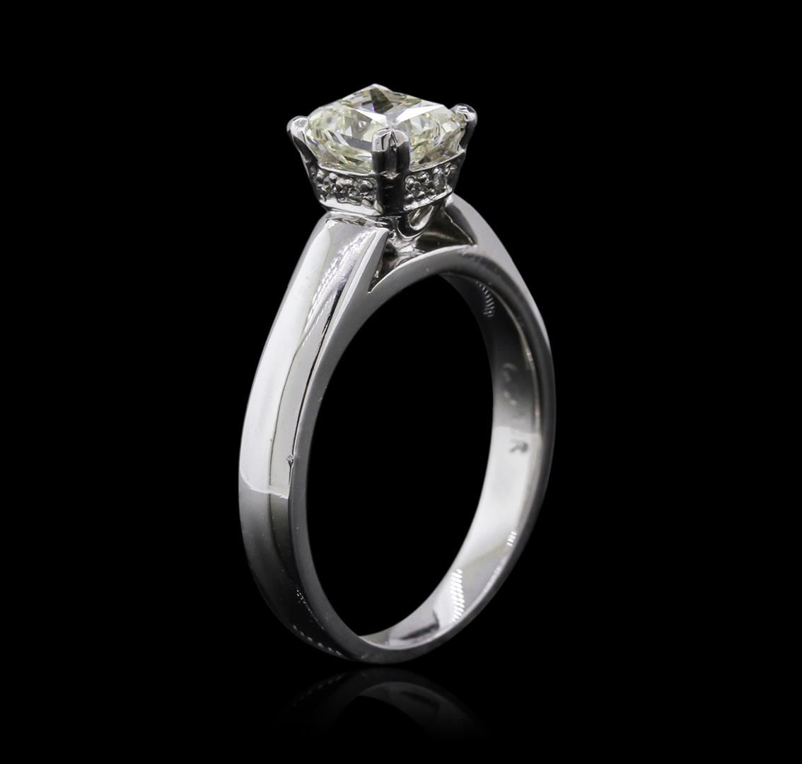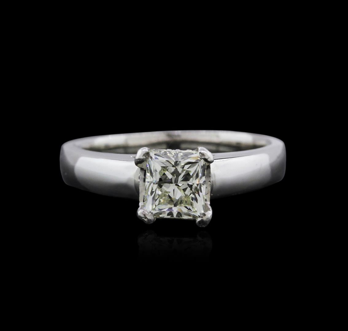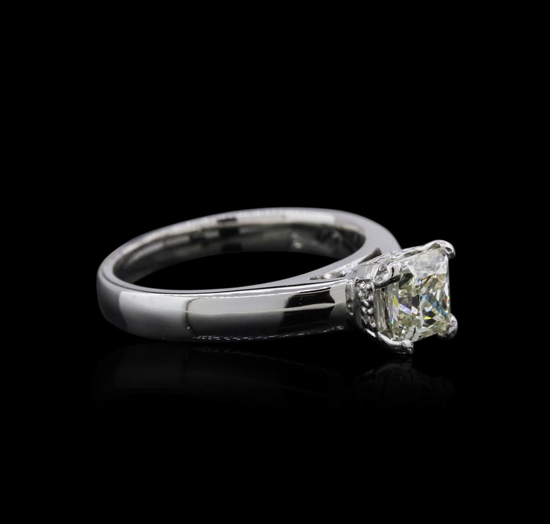 One electronically tested platinum ladies cast diamond engagement ring with a bright polish finish. Identified with markings of "PT 950". Condition is new. Containing: One prong set radiant shaped cut diamond, measuring 5.70 x 5.00 x 3.75mm (depth est.) approximate weight of 0.88ct. Clarity: VS-2. Color: K, Cut is Very Good. Eight prong set round brilliant cut diamonds, measuring 1.20 - 1.20 x 0.72mm (depth est.) approximate total weight of 8 Stones = 0.05ct. Clarity: I-1. Color: H - I, Cut is Good. All diamonds are graded in the mounting, unless otherwise stated. Total Weight of Diamonds 0.93ct. Total Weight of Engagement Ring 6.10 grams. GGL Appraised at $5,830.00.