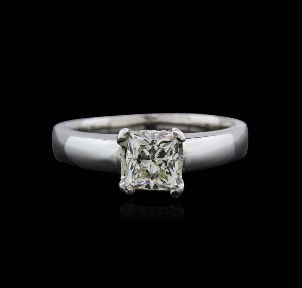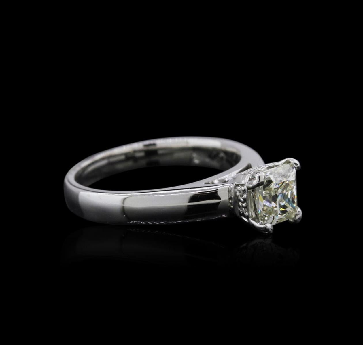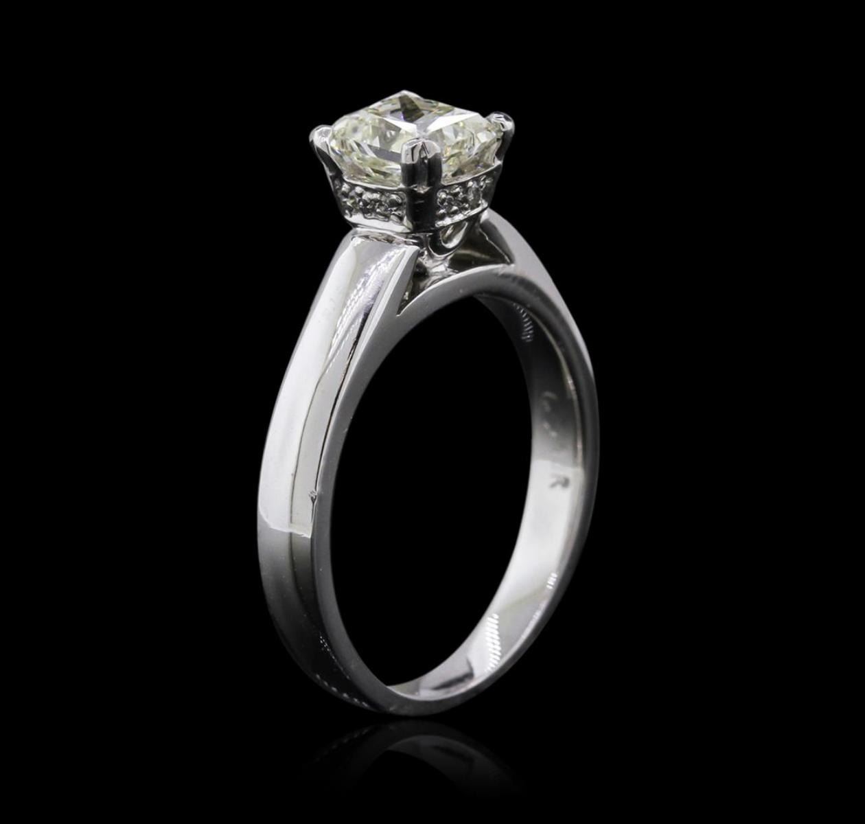 One electronically tested platinum ladies cast diamond engagement ring with a bright polish finish. Identified with markings of "PT 950". Condition is new. Containing: One prong set radiant shaped cut diamond, measuring 5.70 x 5.00 x 3.75mm (depth est.) approximate weight of 0.88ct. Clarity: VS-2. Color: K, Cut is Very Good. Eight prong set round brilliant cut diamonds, measuring 1.20 - 1.20 x 0.72mm (depth est.) approximate total weight of 8 Stones = 0.05ct. Clarity: I-1. Color: H - I, Cut is Good. All diamonds are graded in the mounting, unless otherwise stated. Total Weight of Diamonds 0.93ct. Total Weight of Engagement Ring 6.10 grams. GGL Appraised.