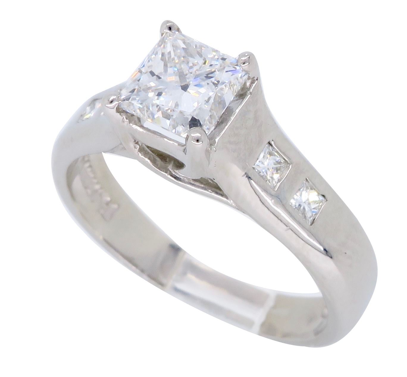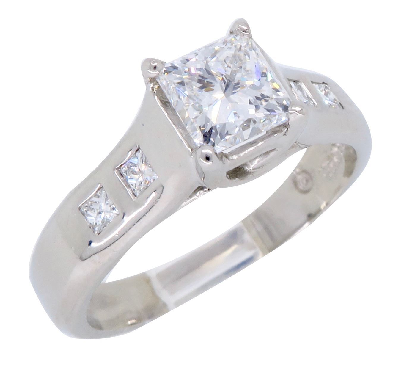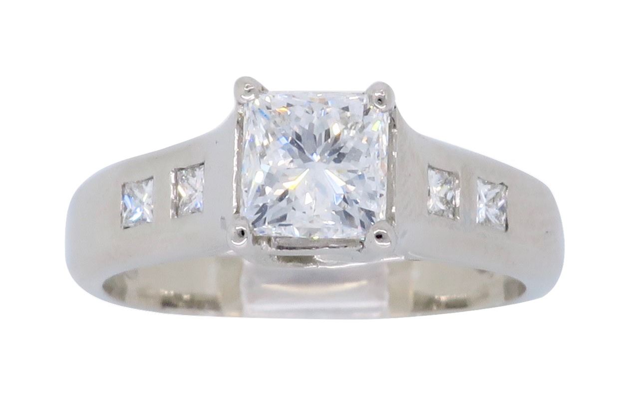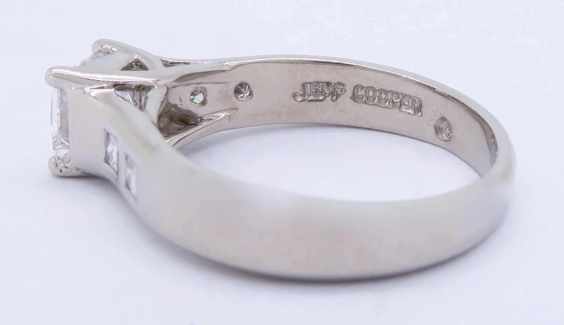 One Platinum 0.96ctw Diamond Ring. (1) Princess cut center Diamond with a total weight of 0.82cts with a color of E-F and clarity of SI-2. Side Diamonds with a total weight of 0.14cts. Total weight of this ring is 6.4 grams.