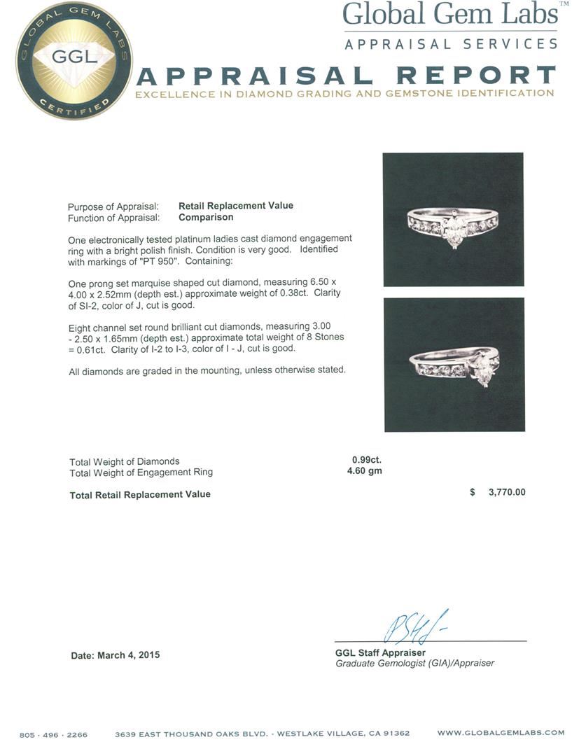 One electronically tested platinum ladies cast diamond engagement ring with a bright polish finish. Identified with markings of "PT 950". Condition is very good. Containing: One prong set marquise shaped cut diamond, measuring 6.50 x 4.00. x 2.52mm (depth est.) approximate weight of 0.38ct. Clarity: SI-2. Color: J, Cut is Good. Eight channel set round brilliant cut diamonds, measuring 3.00. - 2.50 x 1.65mm (depth est.) approximate total weight of 8 Stones = 0.61ct. Clarity: I-2 to I-3. Color: I - J, Cut is Good. All diamonds are graded in the mounting, unless otherwise stated. Total Weight of Diamonds 0.99ct. Total Weight of Engagement Ring 4.60 grams. GGL Appraised at $3,770.00.