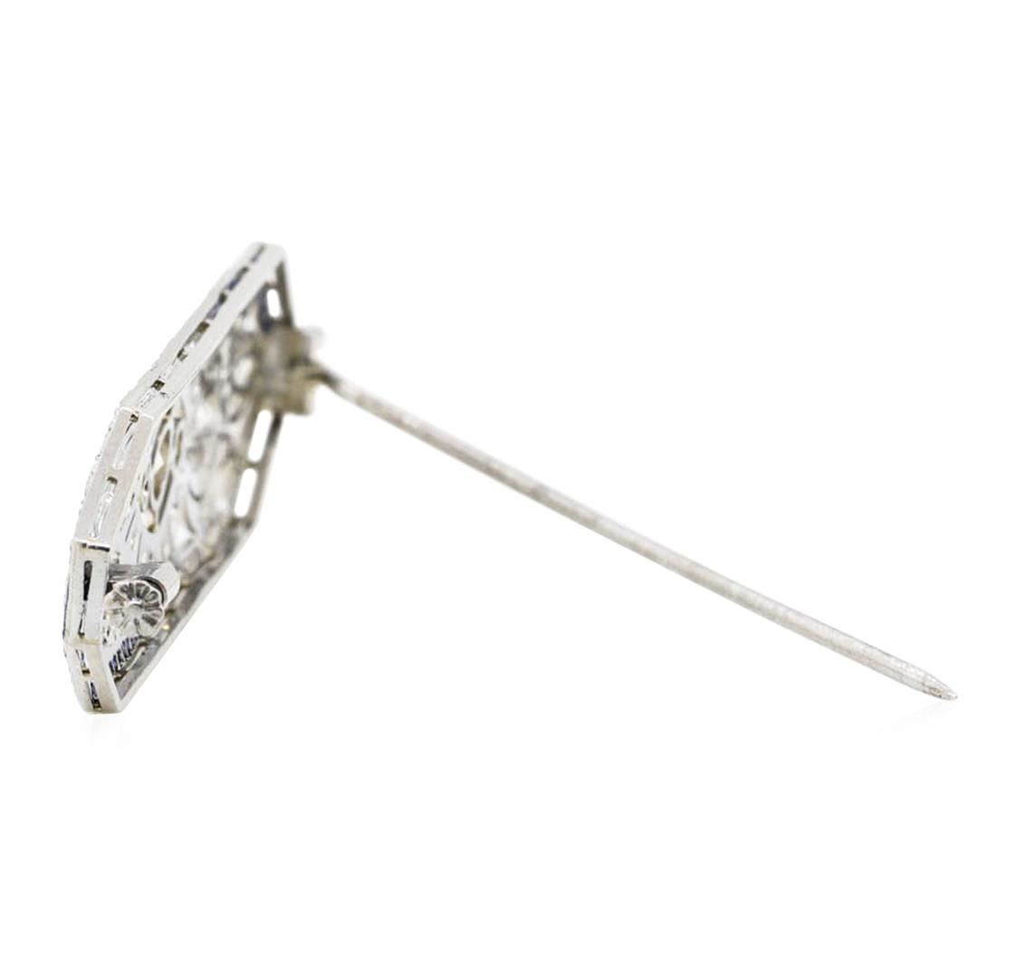 One electronically tested platinum ladies cast & assembled diamond and sapphire brooch. The brooch is completed by a horizontally placed pin. Bright polish finish with milgrain detailing throughout. Area measurements 2.75 x 0.62 inches. The brooch is reminiscent of the jewelry designs from the Art Deco Period. The Paris Exposition of Decorative Arts and Modern Manufacturers in 1925 gave the movement its name. The Art Deco Period is characterized with jewelry designs composed of bold geometric designs, & cubism. Condition is good. Containing: One bezel set Old European cut diamond, measuring 4.70 - 4.60 x 2.35mm (depth est.) approximate weight of 0.35ct. Cutting style circa early 20th century. Graded in the setting. Clarity: SI-2. Color: H Eight bezel and bead set Old European cut diamonds, measuring 2.80 - 2.60 x 1.67mm (depth est.) approximate total weight of 8 Stones = 0.69ct. Cutting style circa late 19th century. Graded in the setting. Clarity: VS-2 to SI-1. Color: H - I One Hundred Twenty bead set Old European and Single cut diamonds, measuring 1.70 x 1.30 x 0.93mm (depth est.) approximate total weight of 120 Stones = 1.62ct. Cutting style circa early and late 19th century. Graded in the setting. Clarity: SI-1 to I-1. Color: G - I Forty-eight channel set rectangular step cut natural blue sapphires, measuring 1.60 x 1.20 x 0.78mm, approximate total weight of 1.00ct., clarity is slightly included, type II, medium dark, very slightly grayish, violetish blue color, (GIA vB 6/3), cut is good. Transmitting light with a minimum of distortion, transparent. Naturally occurring internal & external characteristics are present. Measurements & the color grade are an average for the group. Graded in the setting. Total Weight of Colored Stones 1.00ct. Total Weight of Diamonds 2.66ct. Total Weight of Brooch 12.30 grams. AIG Appraised at $12,275.00.